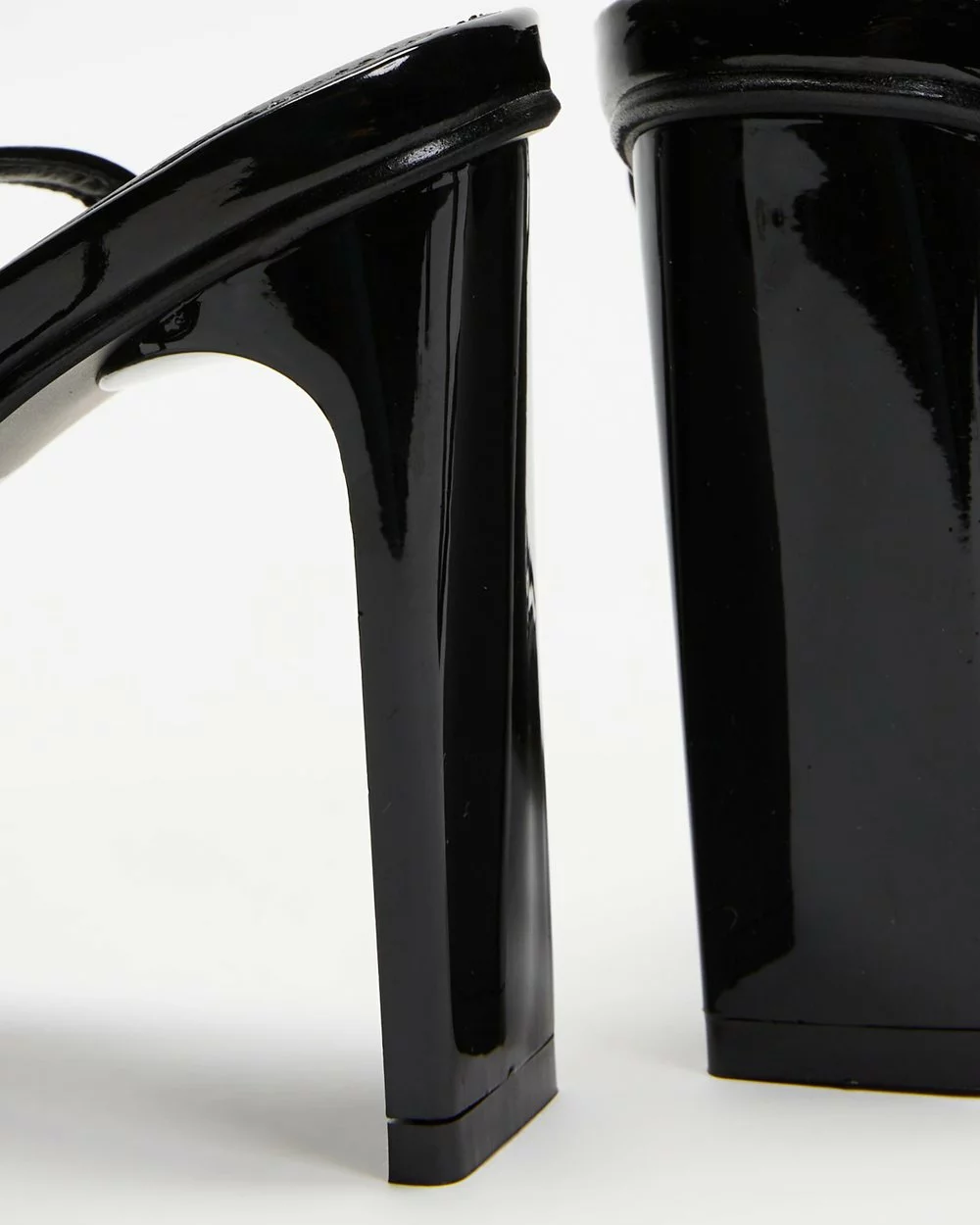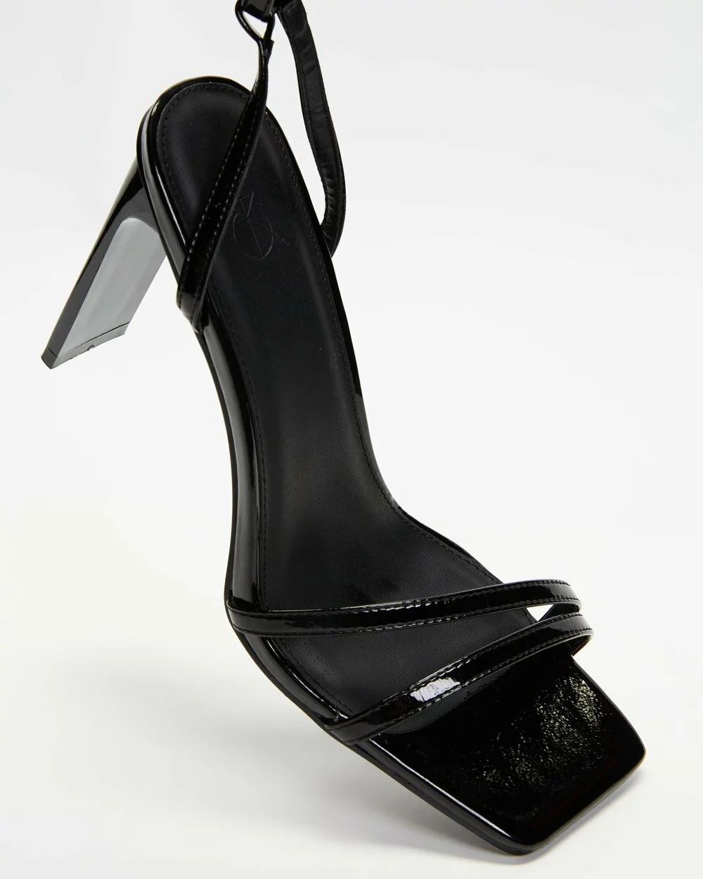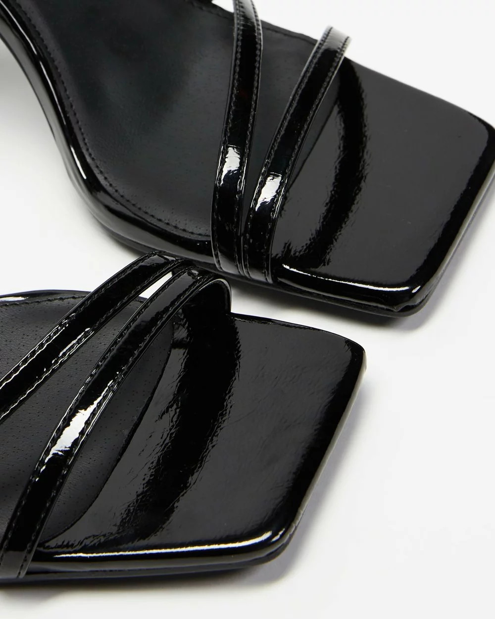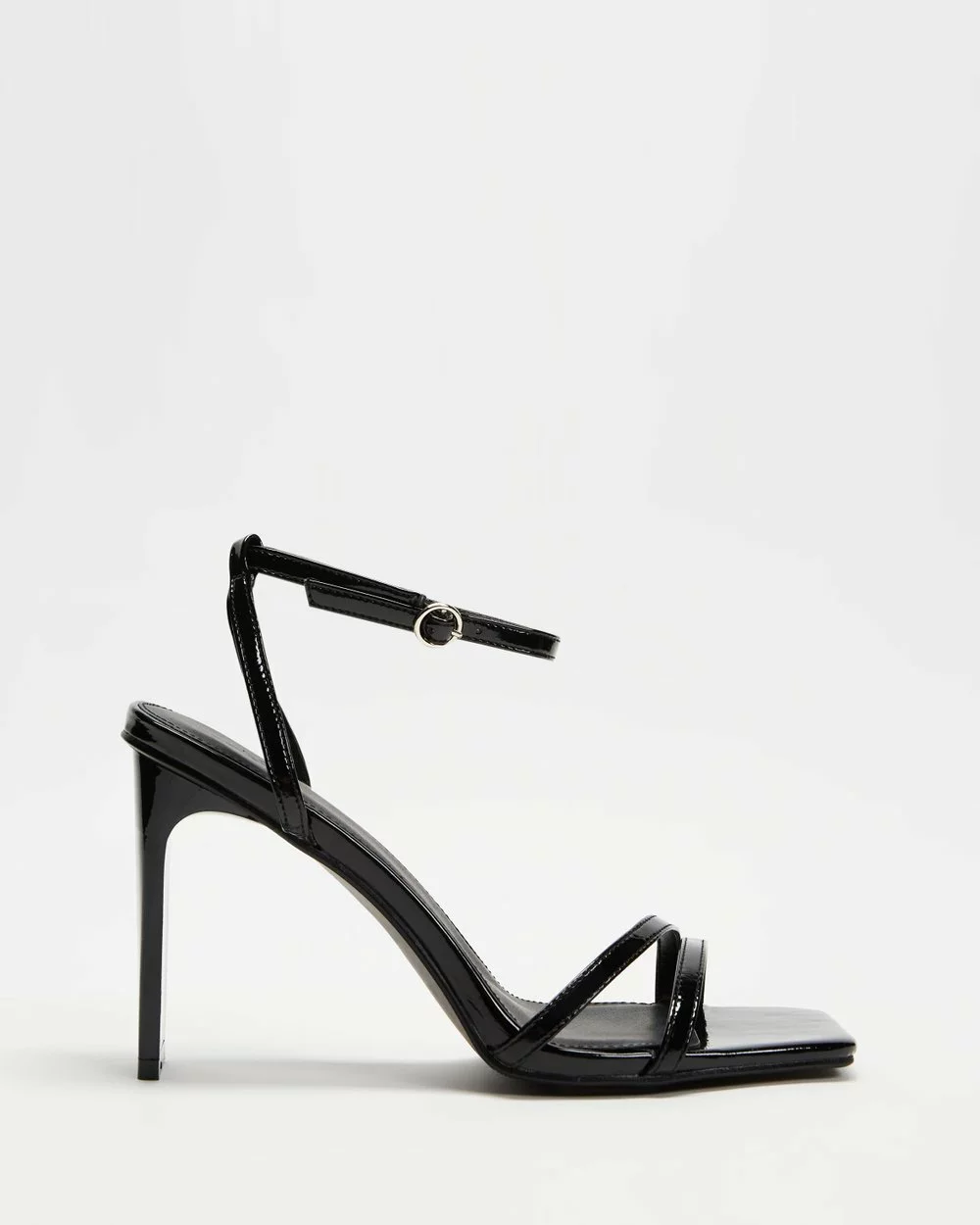 The Percy Heeled Sandals by 4th & Reckless features a patent faux-leather finish on a high stiletto heel to lengthen your legs and level up your party wardrobe.