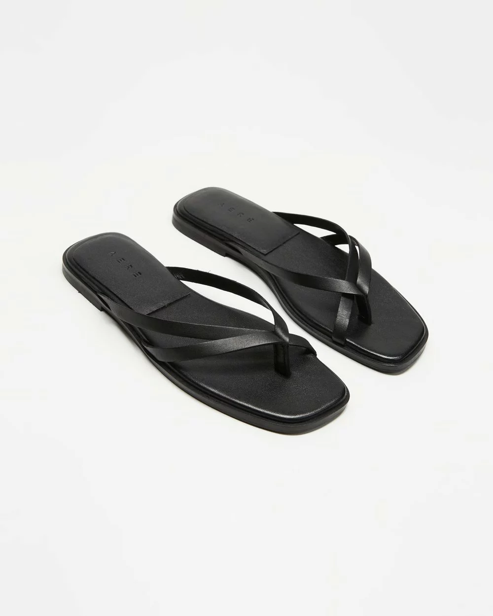 The Asymmetrical Leather Thong Sandals by AERE are the perfect barely-there partner to breezy linen dresses or bleached denim.