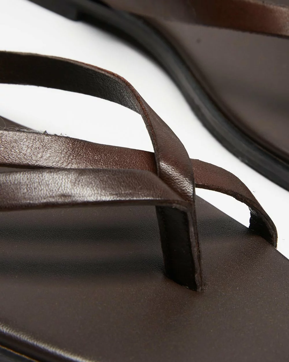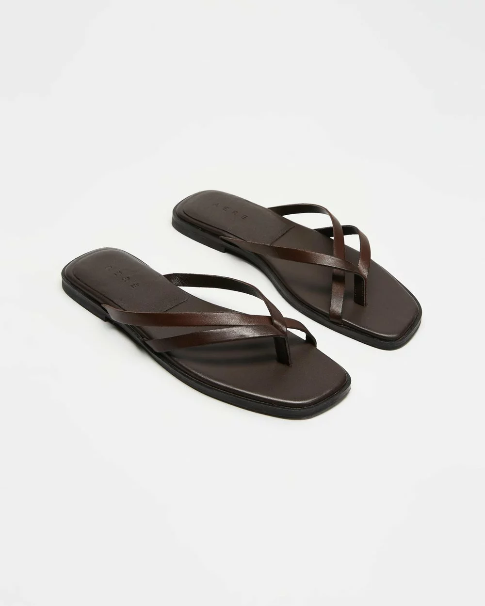 The Asymmetrical Leather Thong Sandals by AERE are the perfect barely-there partner to breezy linen dresses or bleached denim.