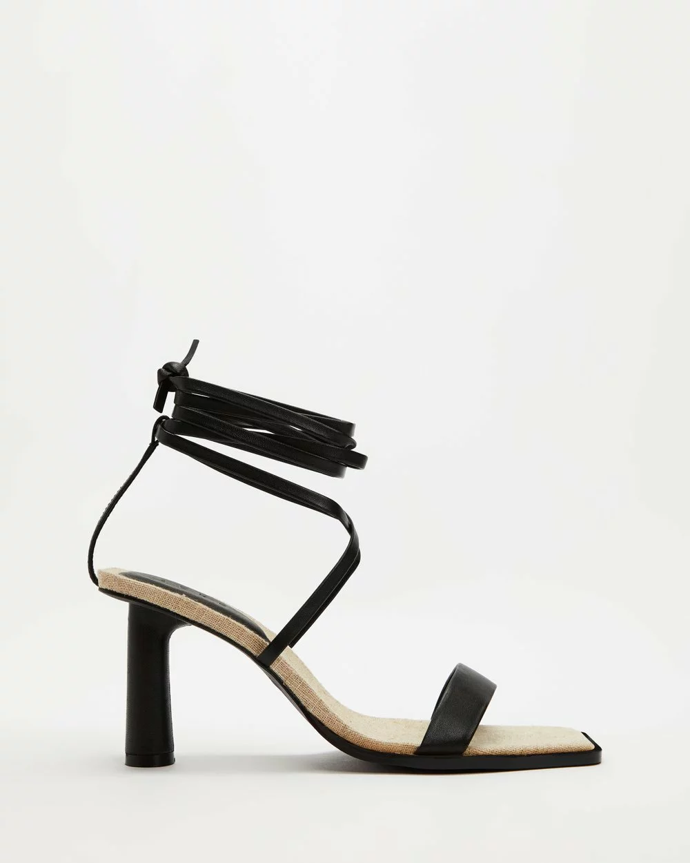 The Linen Leather Ankle Wrap Heels by AERE artfully frame the foot in a barely-there wrapped style and squared toe, making for an elegant addition to your ensemble.