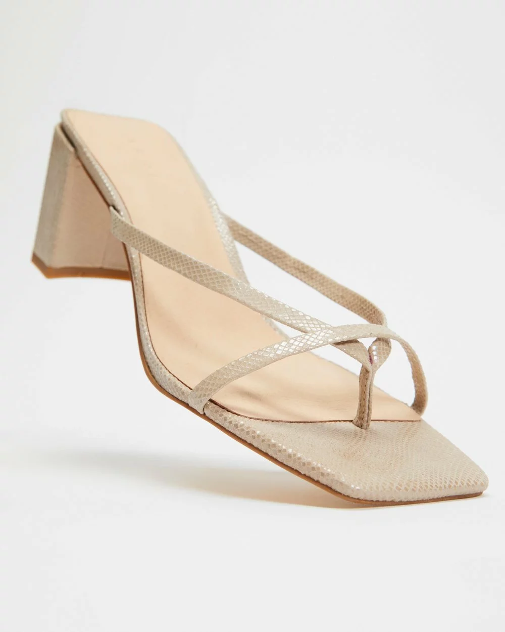AERE brings back the simple sensuality of barely-there heels with the très chic Strappy Leather Block Heel Thongs.