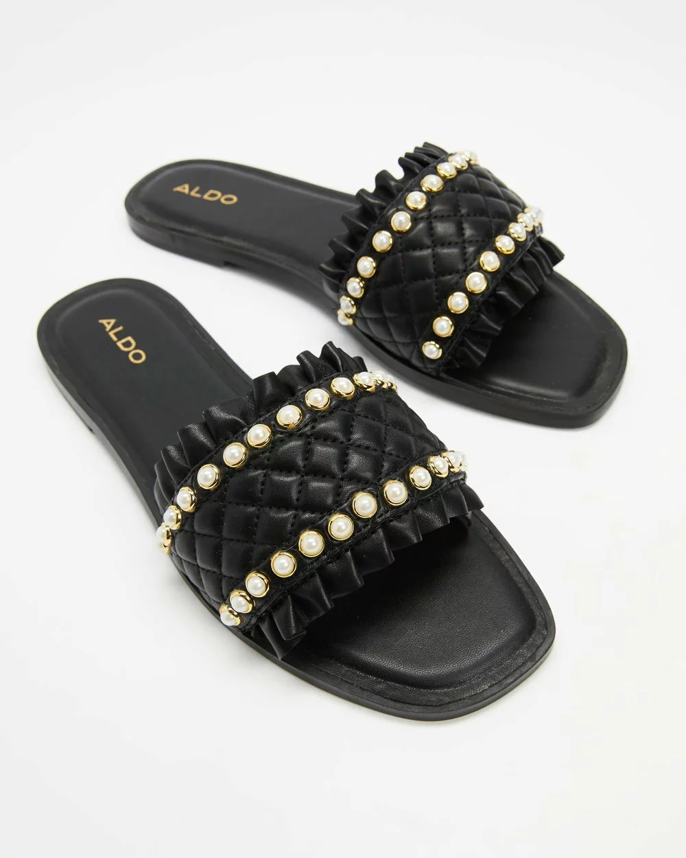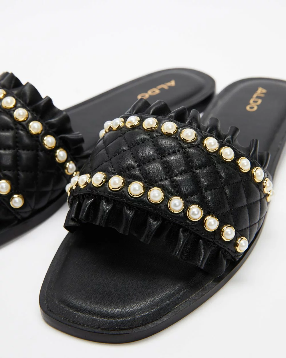 – Wide vamp strap with ruffle trims and pearl-like embellishments