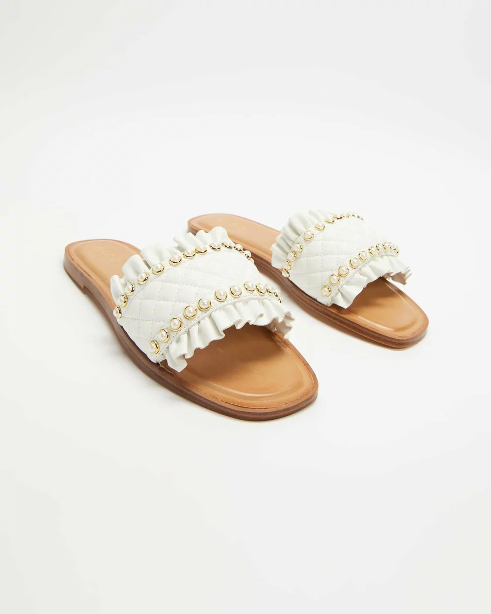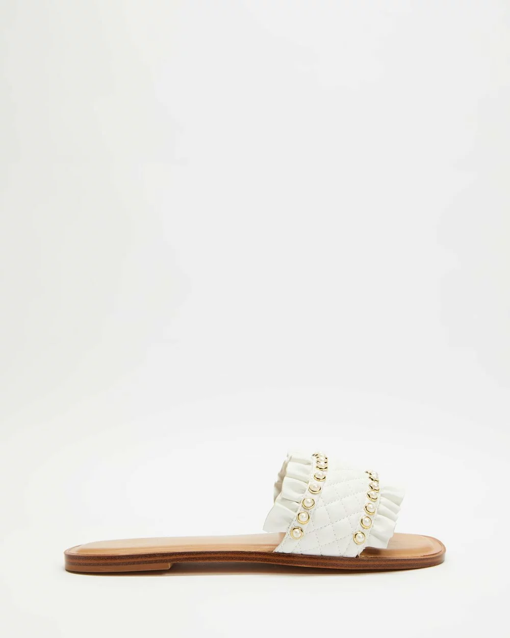 – Wide vamp strap with ruffle trims and pearl-like embellishments