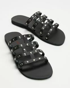 – Leather strappy upper – Silver-toned metal stud detailing – Slip on design – Round toe