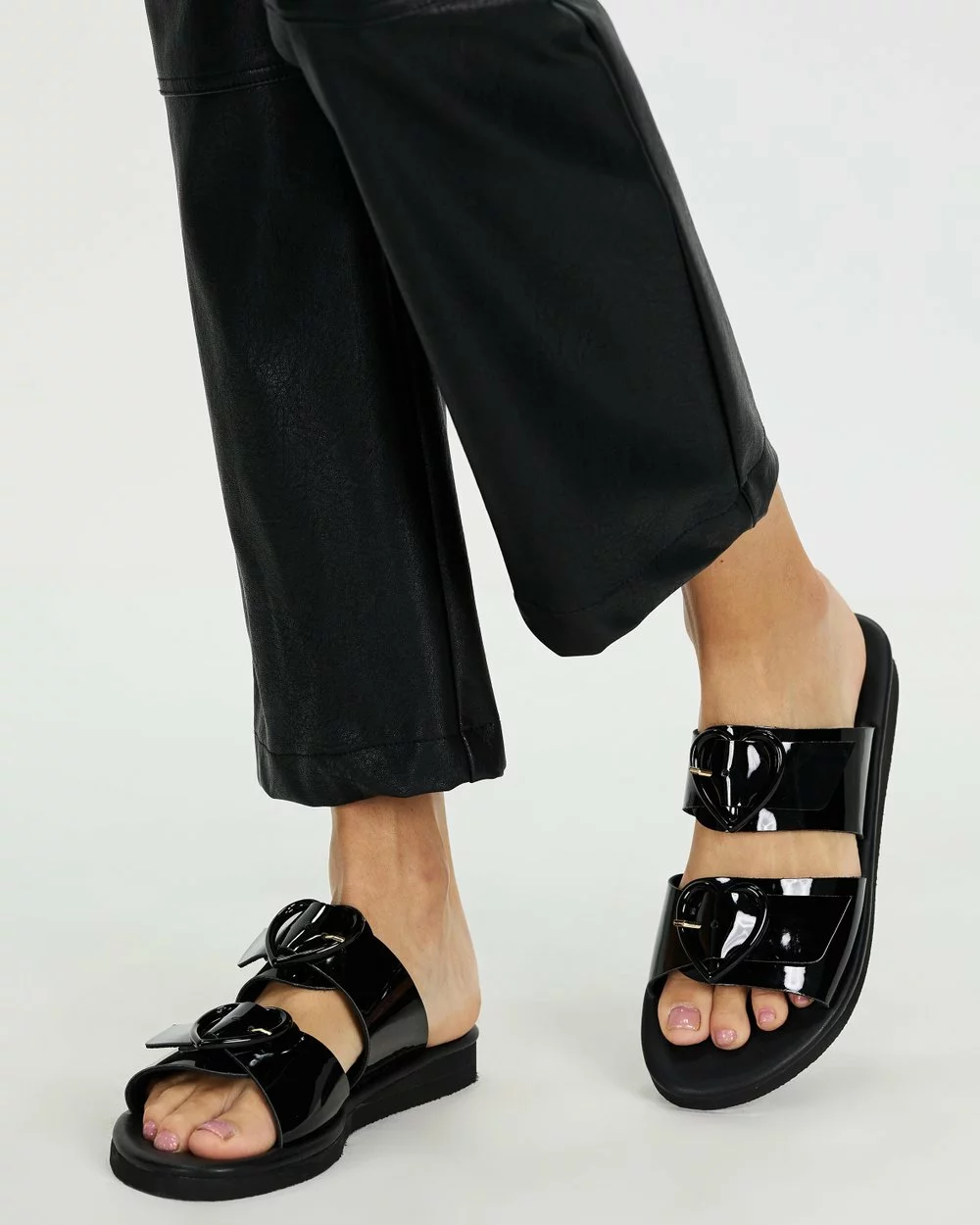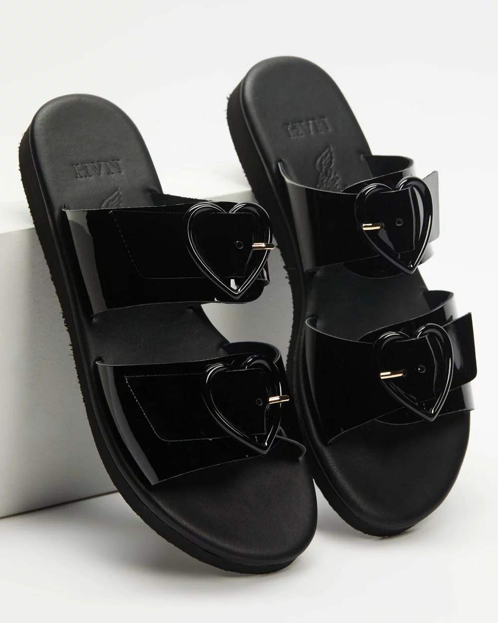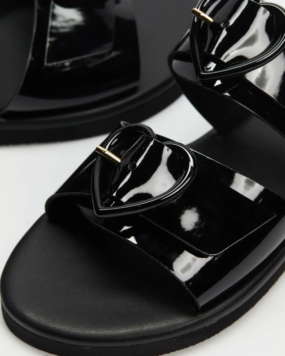 – Twin thick vamp straps; heart-shaped polished buckle