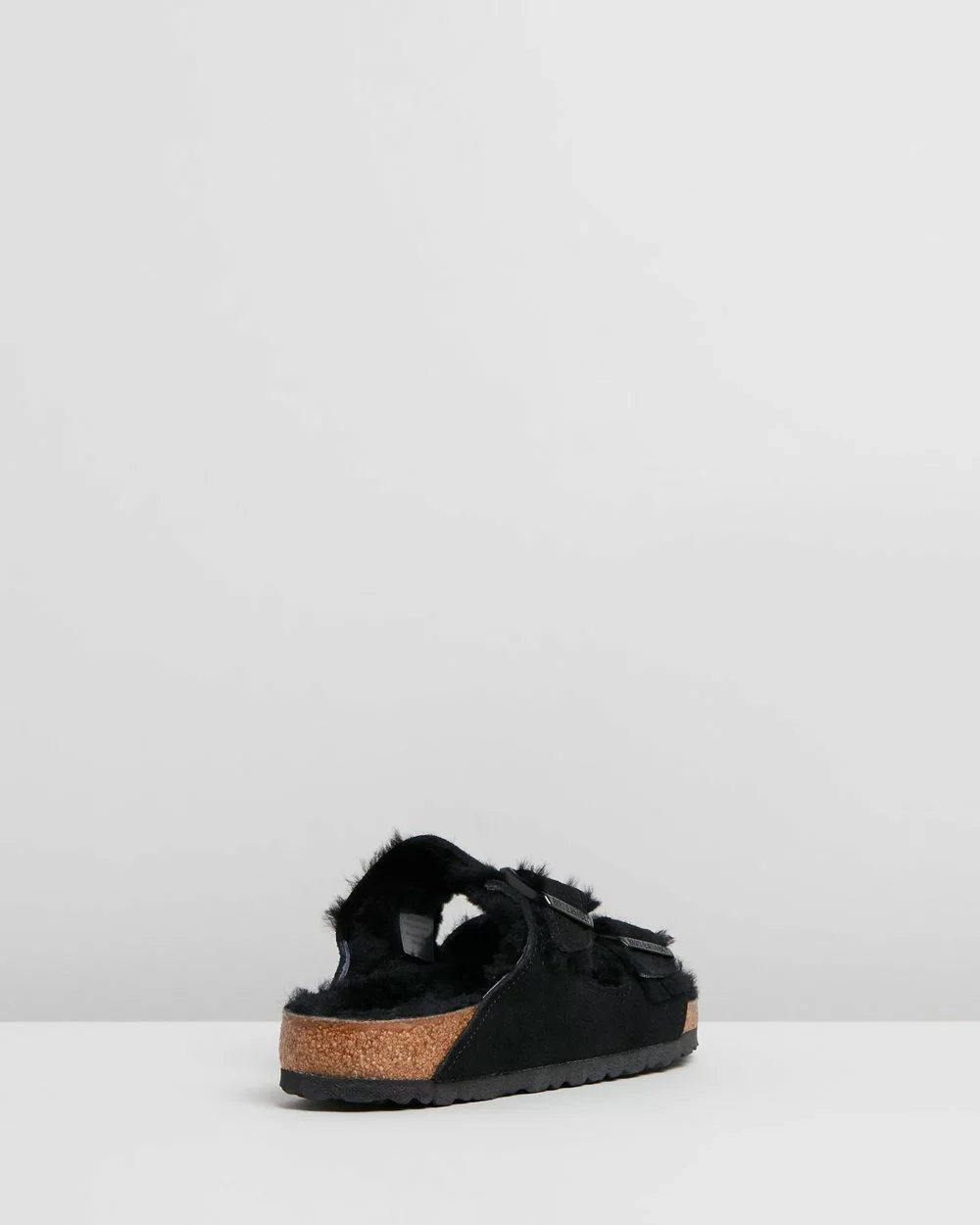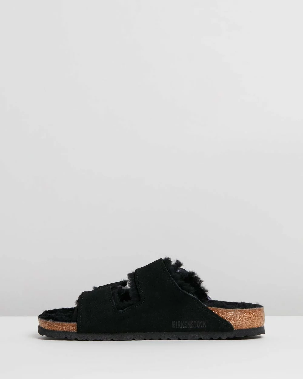 The Arizona Regular slides are a symbol for the Birkenstock brand worldwide. A cosier take on the style, this pair is made from smooth suede leather with shearling lining, and comes in a classic black hue.
