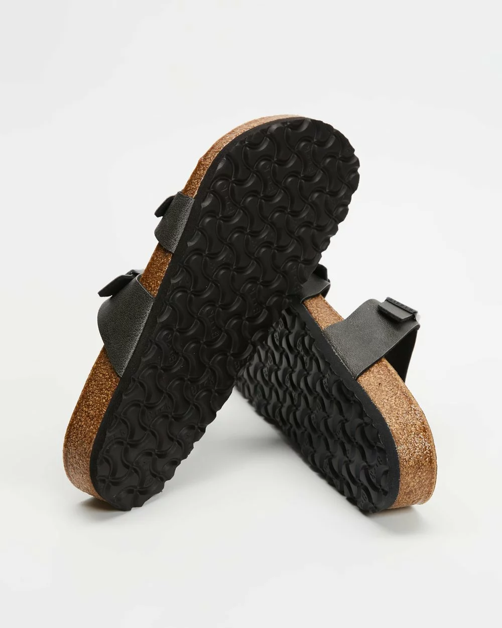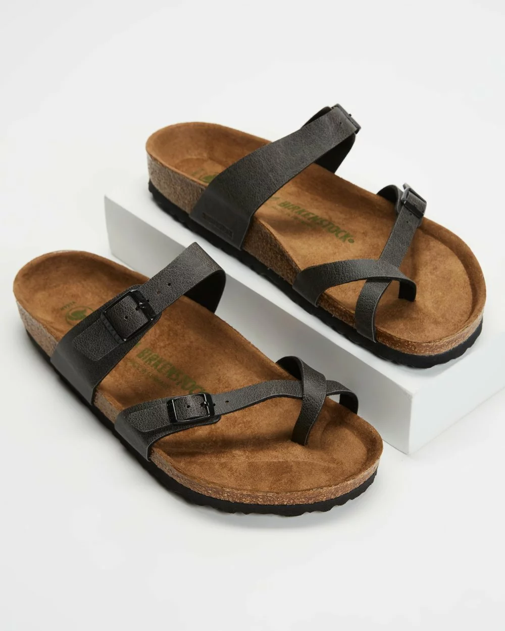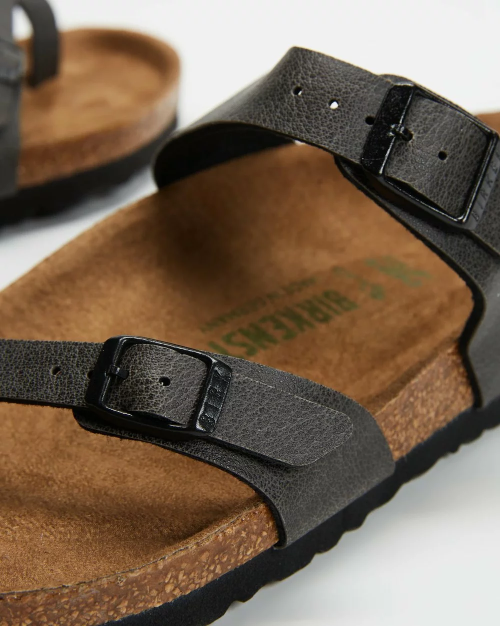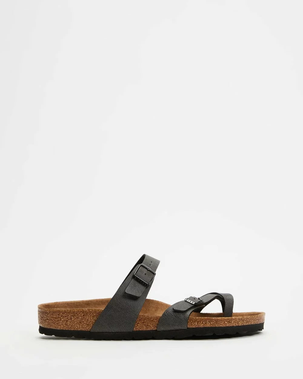 A sleek and comfortable choice for summer, the Birkenstock Mayari Vegan sandals feature a leather-look upper, slender buckle-up straps, and a durable EVA sole.