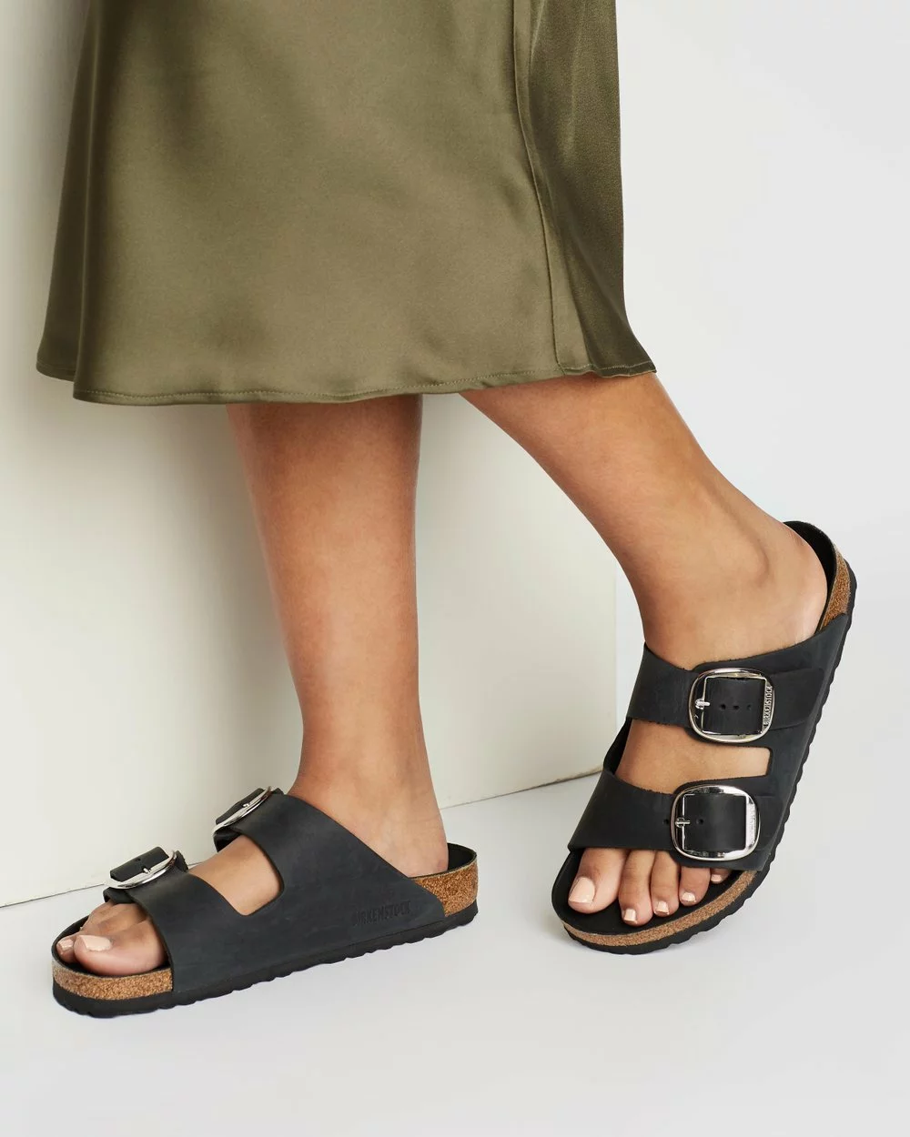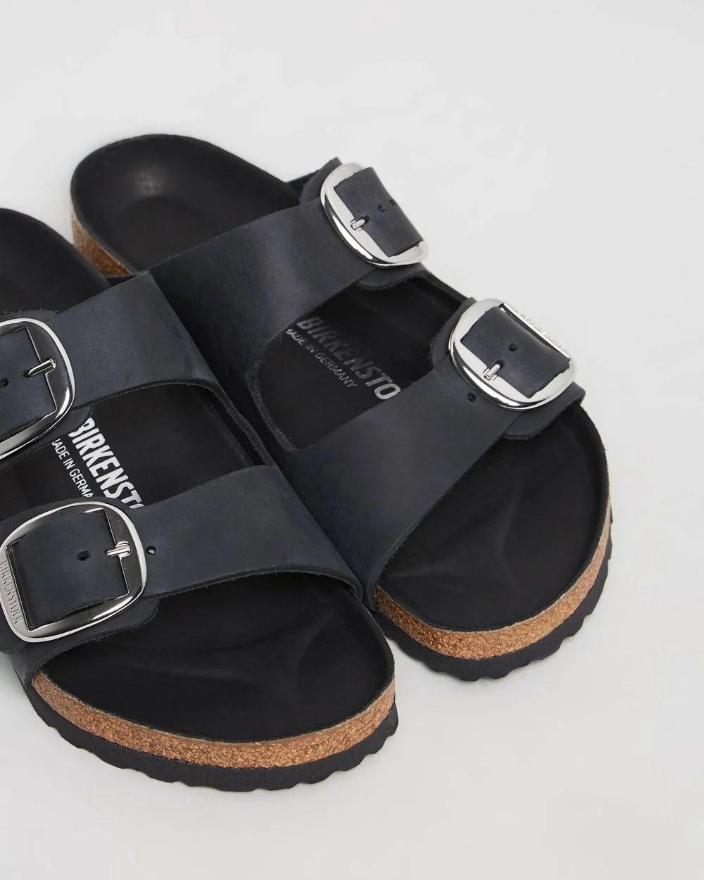 A stylish spin on the famed Birkenstock leather sandal, Arizona Big Buckle Regular features the signature shaped cork-latex footbed and slide-on design but with wide vamp straps and enlarged strap buckles.