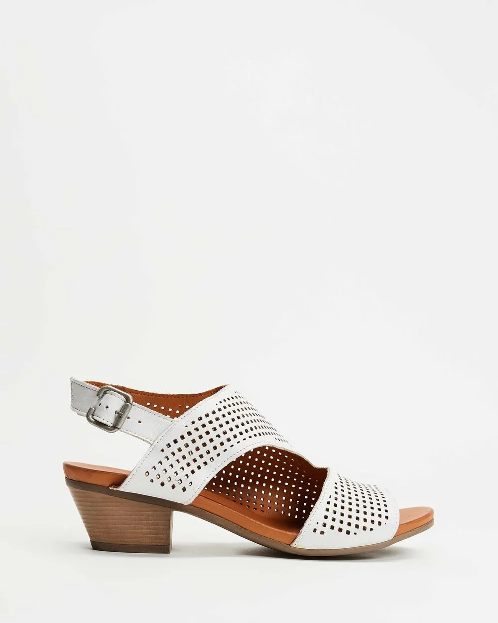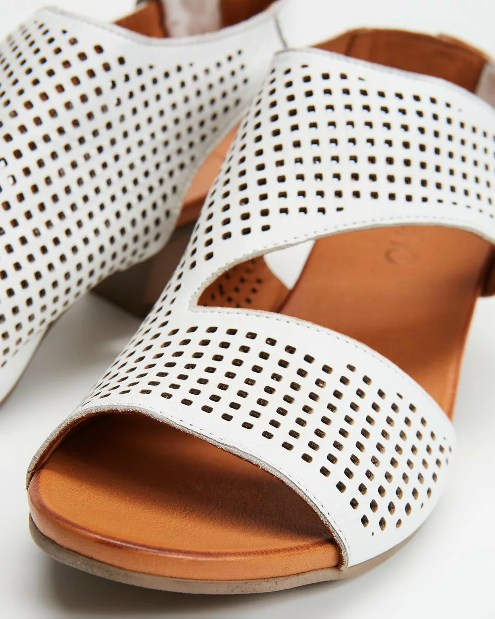 – Smooth leather upper- Perforated design – Block heel; 5cm – Buckle adjustable ankle strap- Open toe