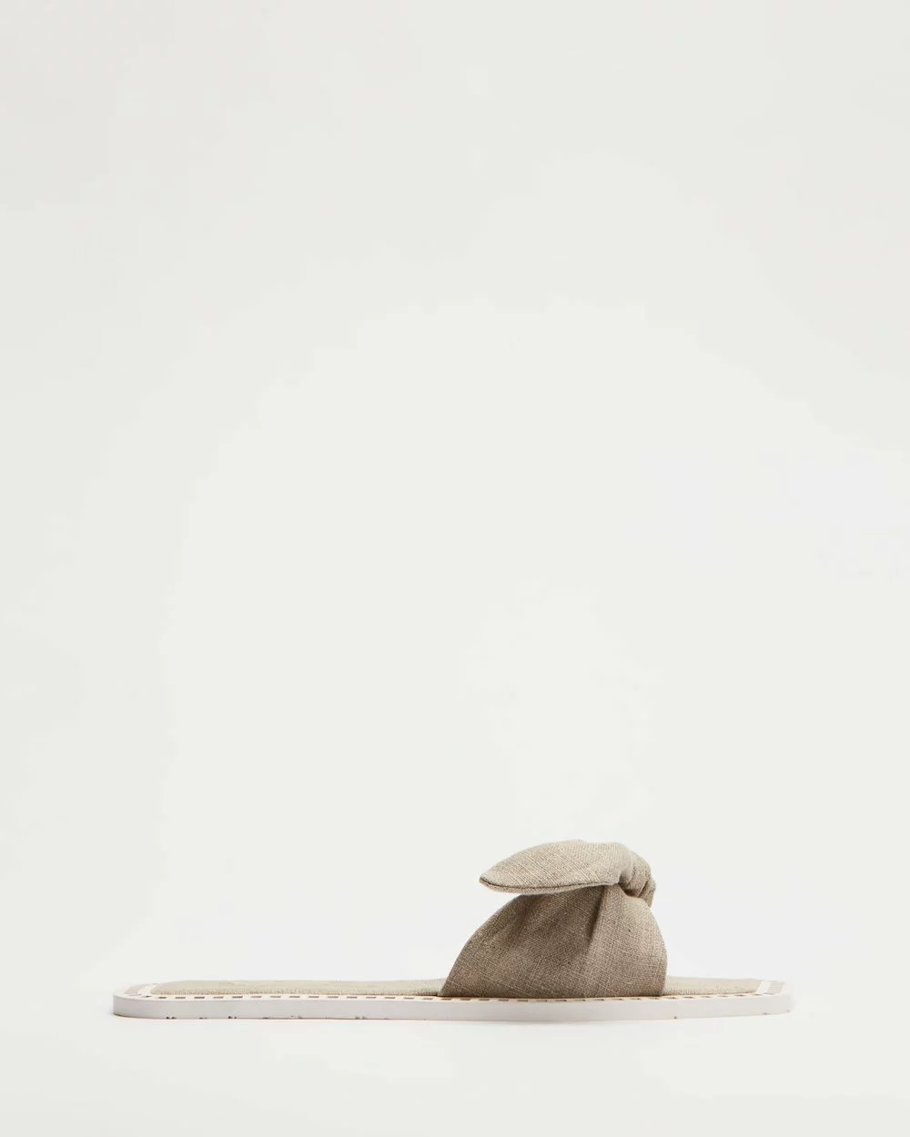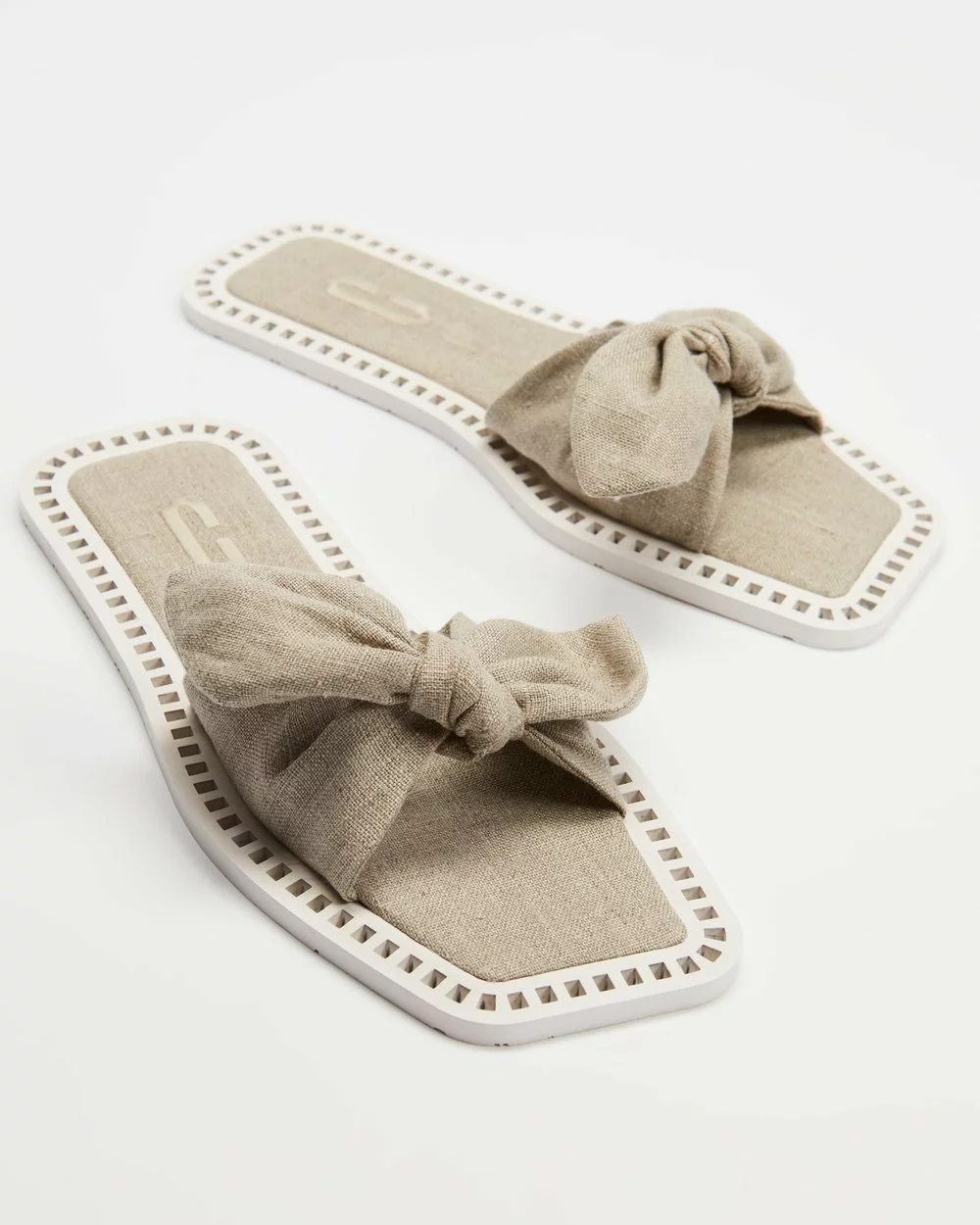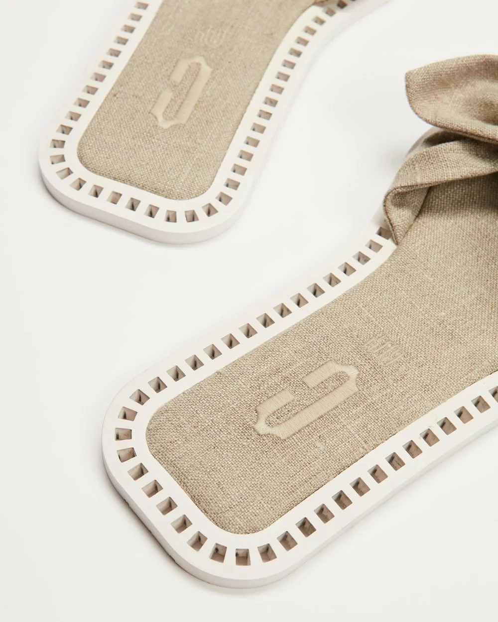 For a range of considered, contemporary footwear that lets you feel the earth beneath your feet, look no further than Carlotha Ray. Slip into the Italian-made Lino Knot Slip-On Sandals this season to complement your roster of sun dresses, finished in a natural linen hue with delicate knotted detail and architectural cut-out sole detailing.