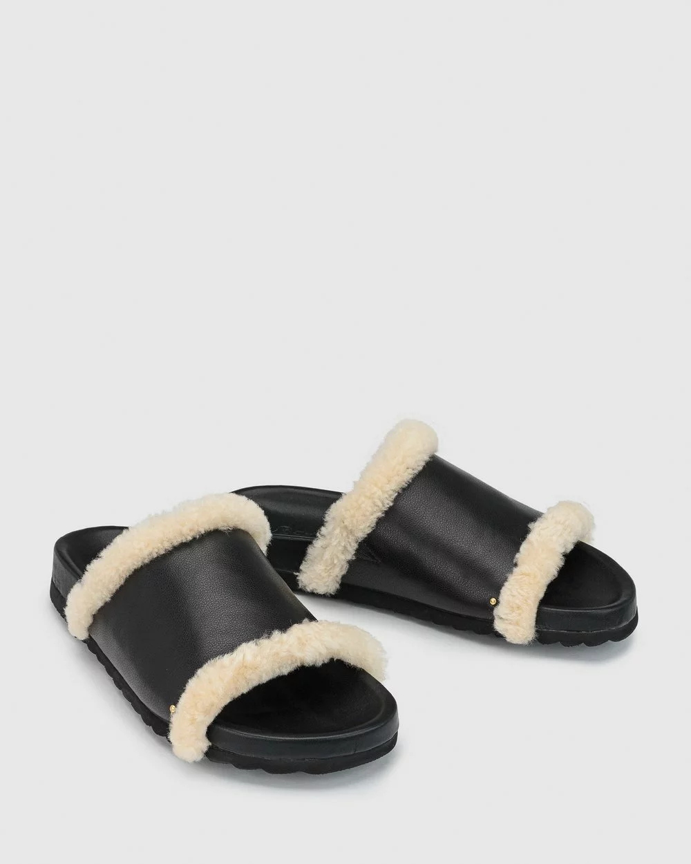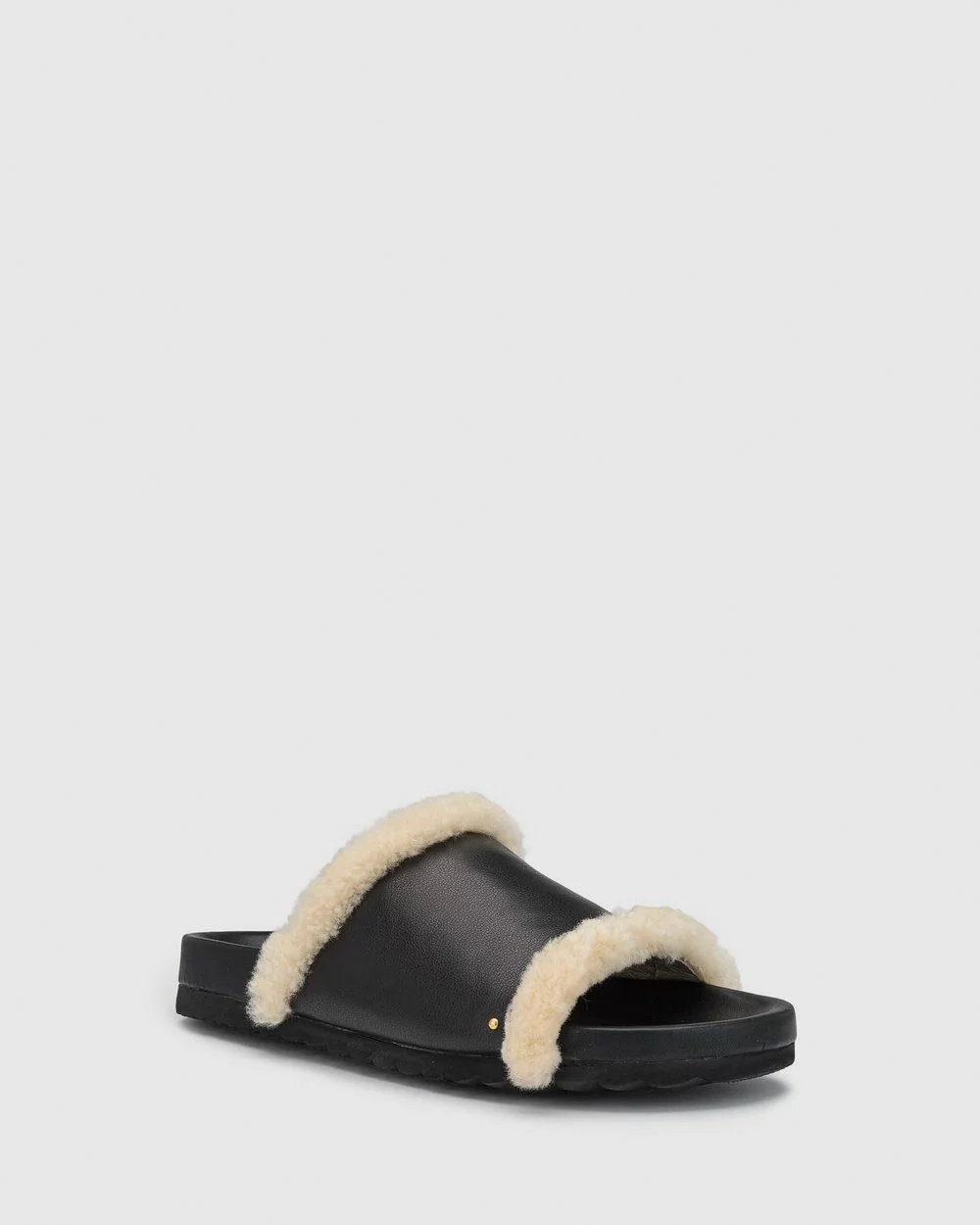 – Black leather slide with shearling detail & gold stud- Soft leather lining- Black rubber outsole- 30mm / 1.18 inch heel- Fits true to size- We recommend a good leather/suede protectant to protect your shoes- Made in Dongguan, China