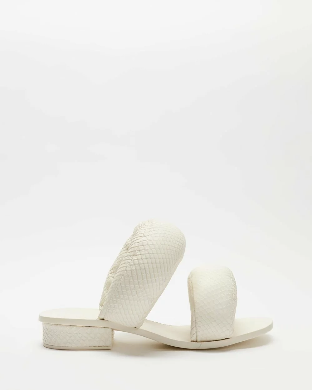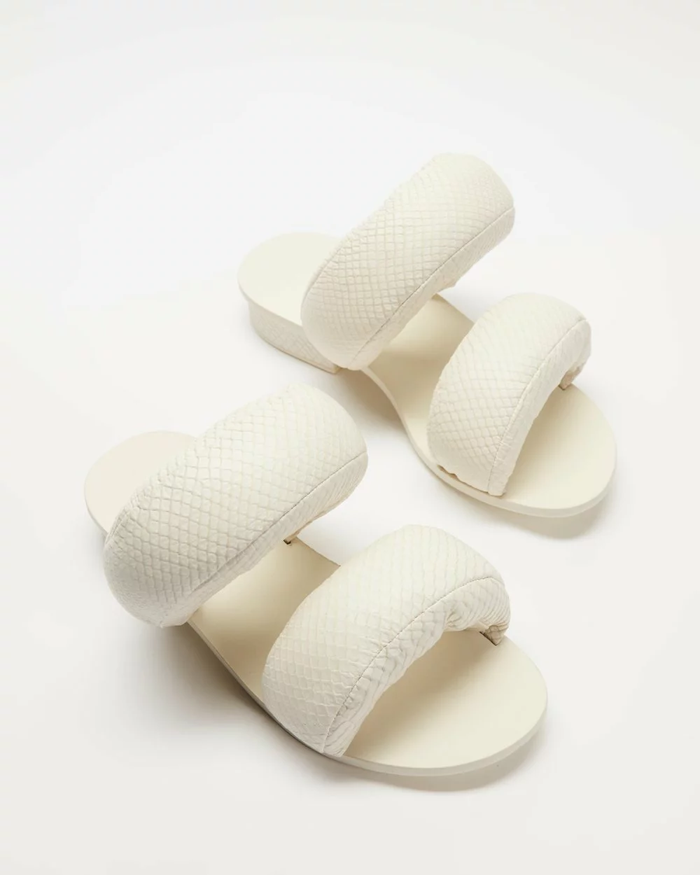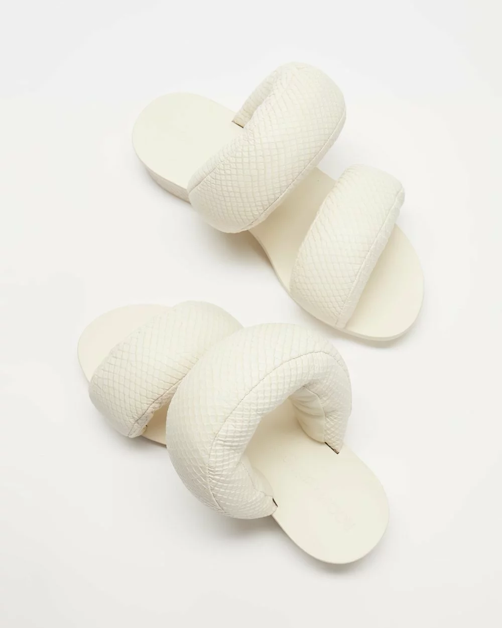 Anchored in an ethos that says everything is art, LA-based label Cult Gaia transforms traditional notions of design with a capsule collection of accessories, shoes and apparel that blurs the line between utility and art. With exaggerated puff pillow straps finished in a tactile snake-embossed leather, the cloud white Pillow Sandals are the statement slides of the season.