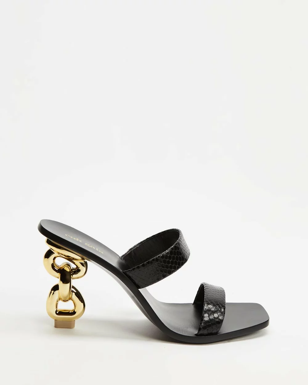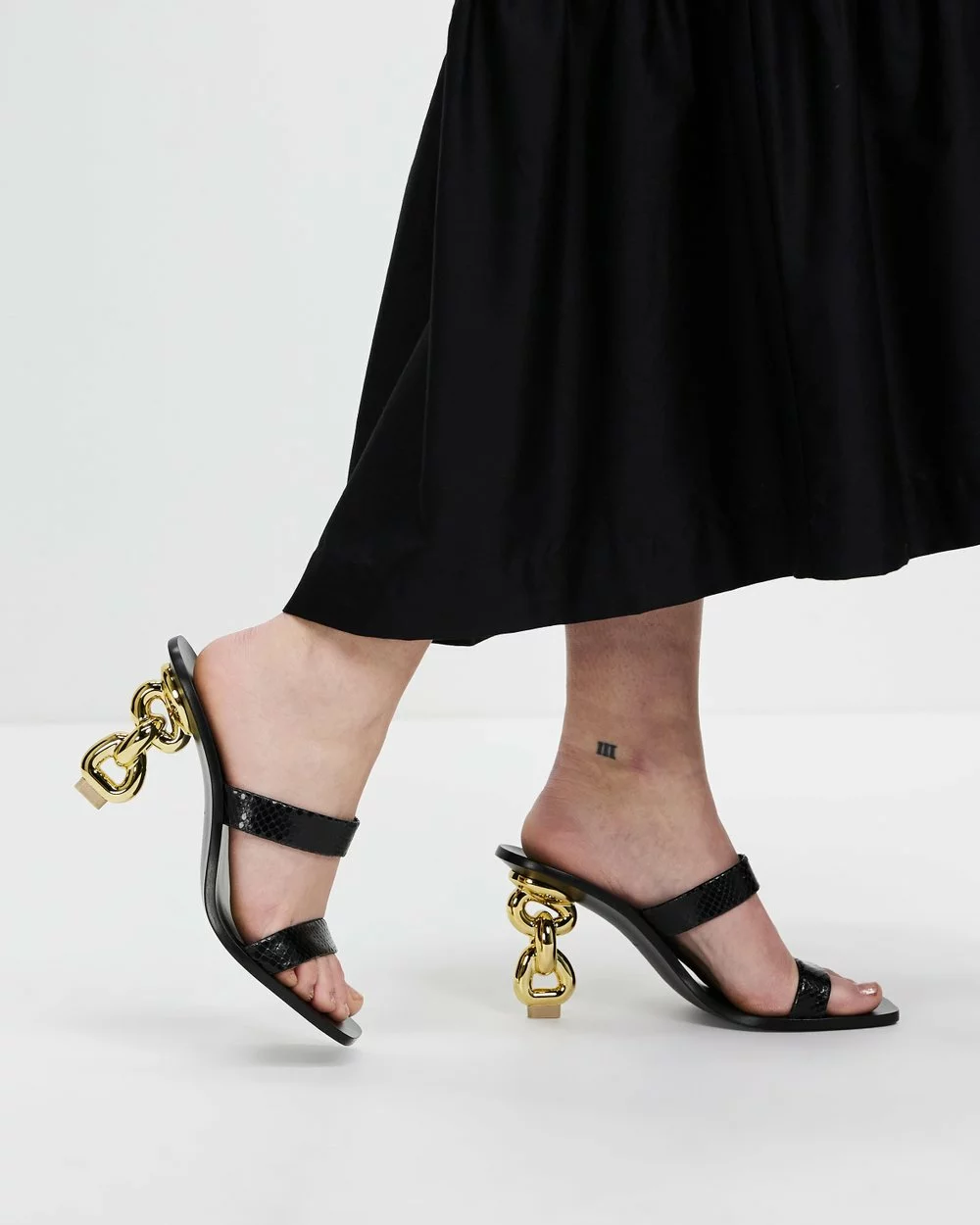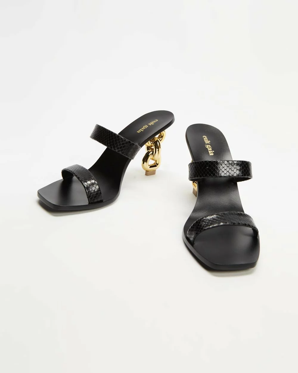 The Vivianne Sandals from Cult Gaia feature a subtle snakeskin-textured leather upper that sits atop a unique chain-look sculptural heel.