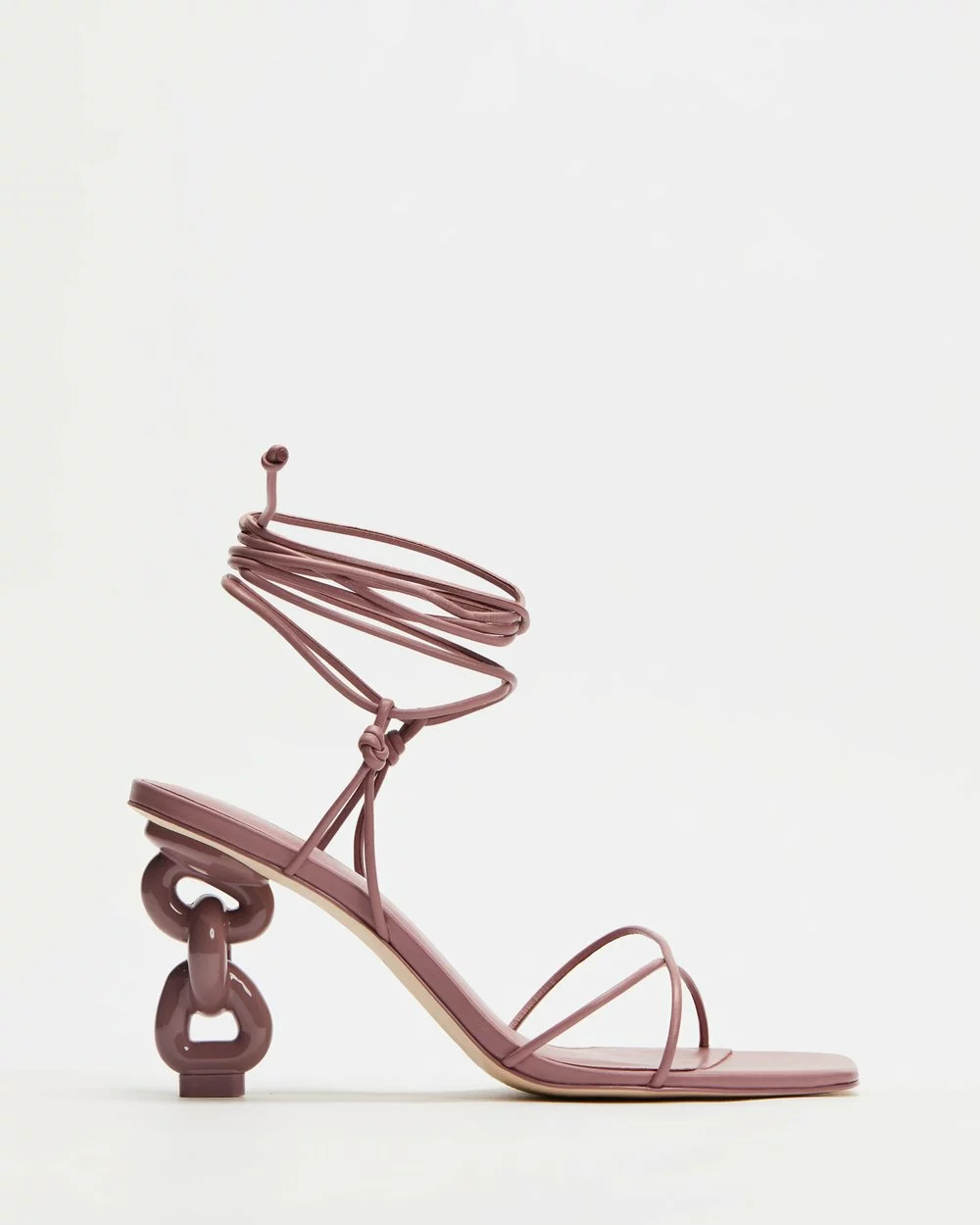 Anchored in an ethos that says everything is art, LA-based label Cult Gaia transforms traditional notions of design with a capsule collection of accessories, shoes and apparel that blurs the line between utility and art. Delivered in a mulberry-pink hue, the Zadie Sandals are set upon a tonal chain-inspired heel for an architectural silhouette.