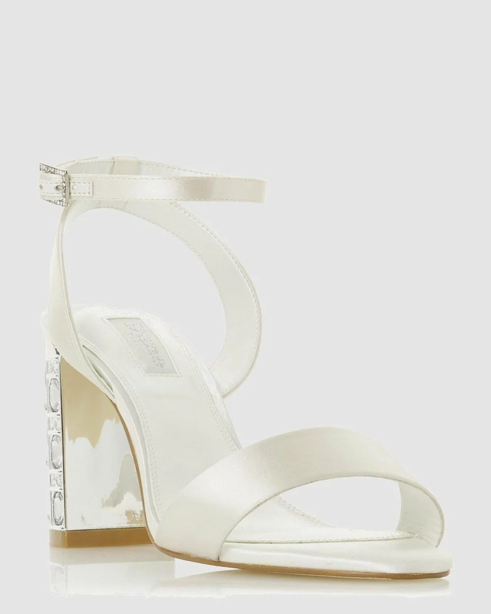 Dune London is a luxury English footwear and accessories brand, devoted to crafting high quality, innovative pieces. The Dune London Mine bridal shoe exudes comfort with a memory foam sock padding to ensure comfortable all day wear. Featuring embellished crystals on the sole and slim toe strap , it is presented in an satin dust bag and ivory gift box.