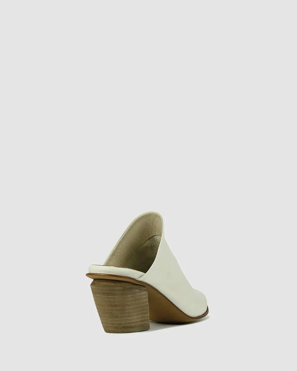 – Made and hand-finished in Portugal- Classic ‘Mule’ – Rushed leather – Open back for convenience- Mid-low heels- Cream White shades