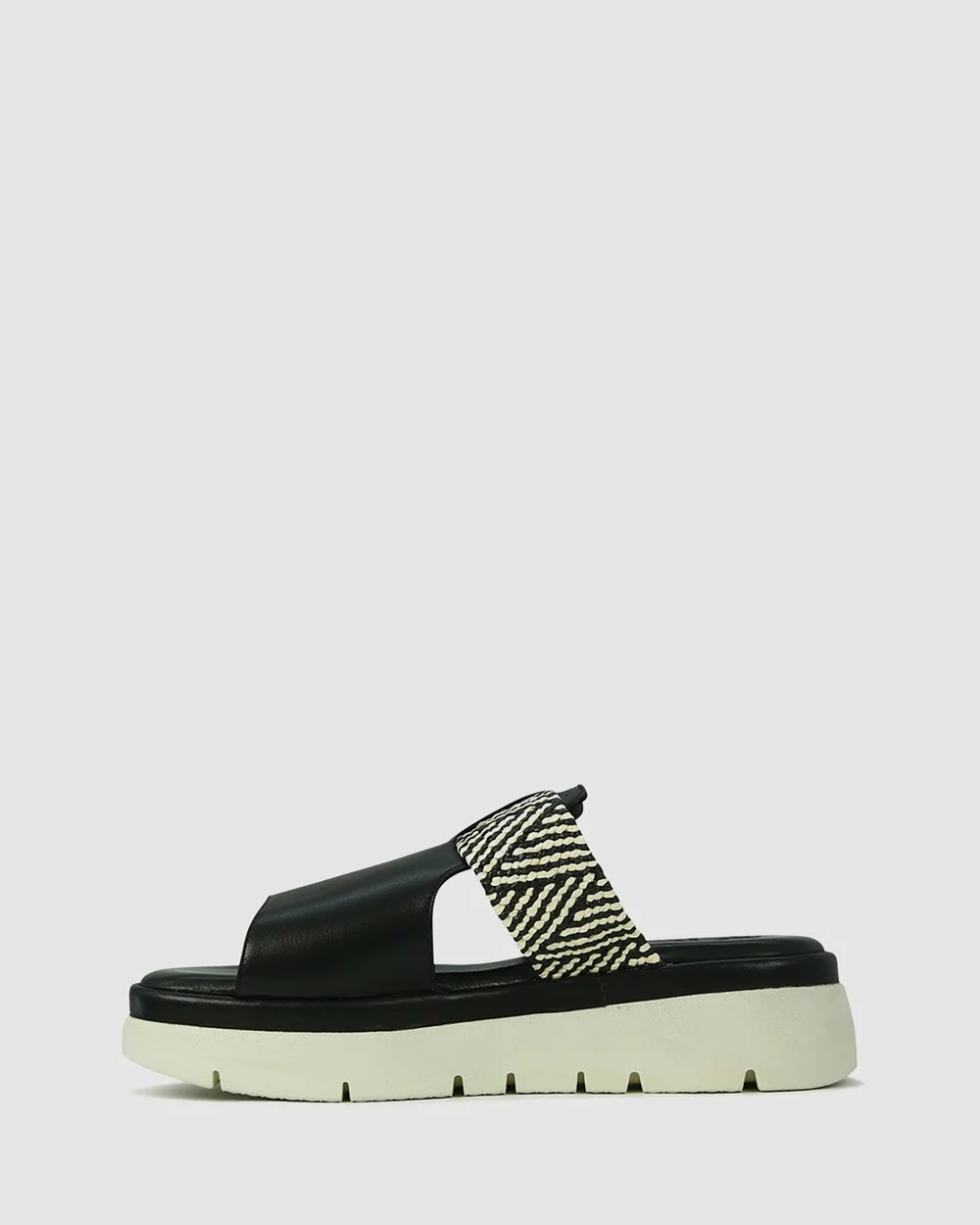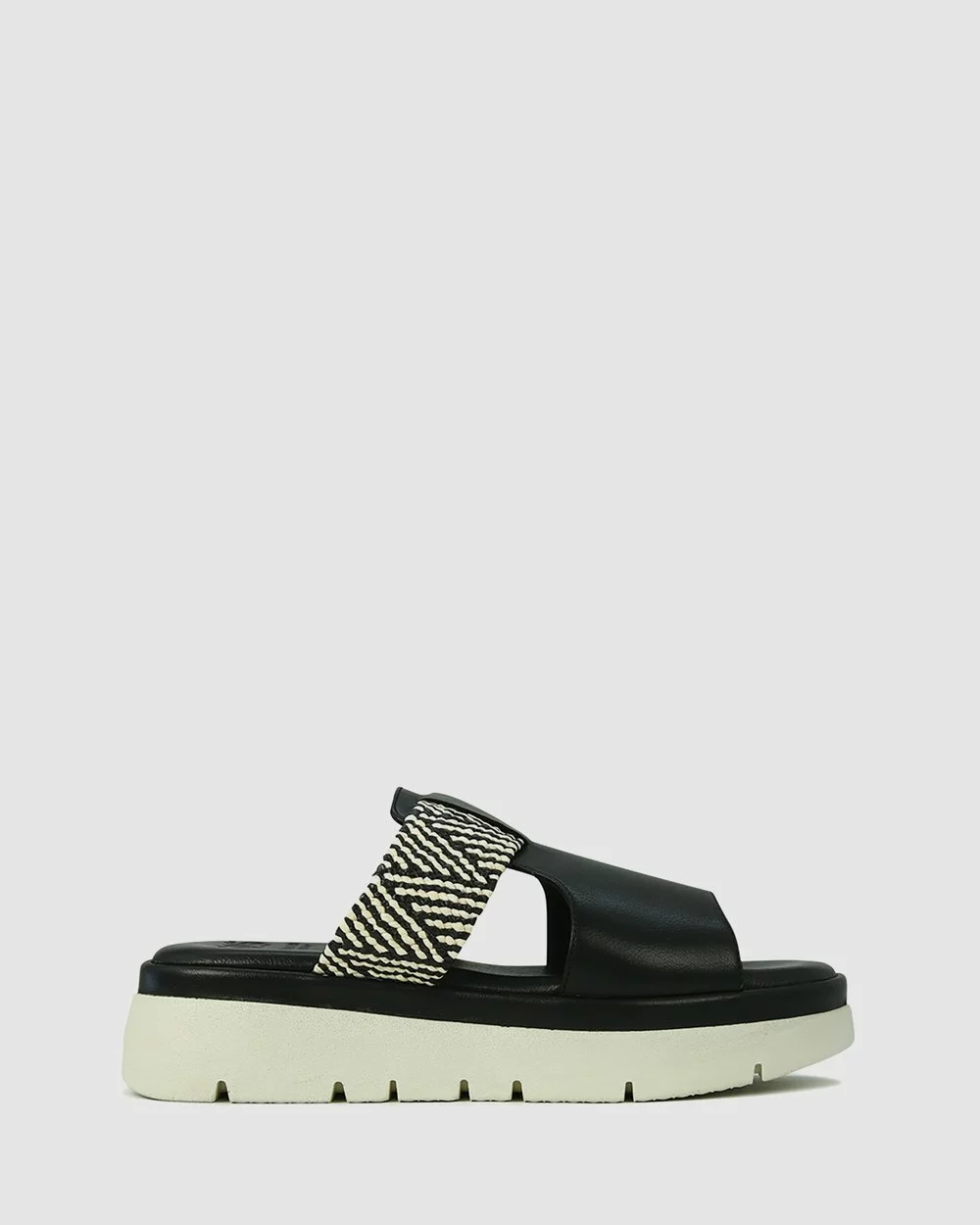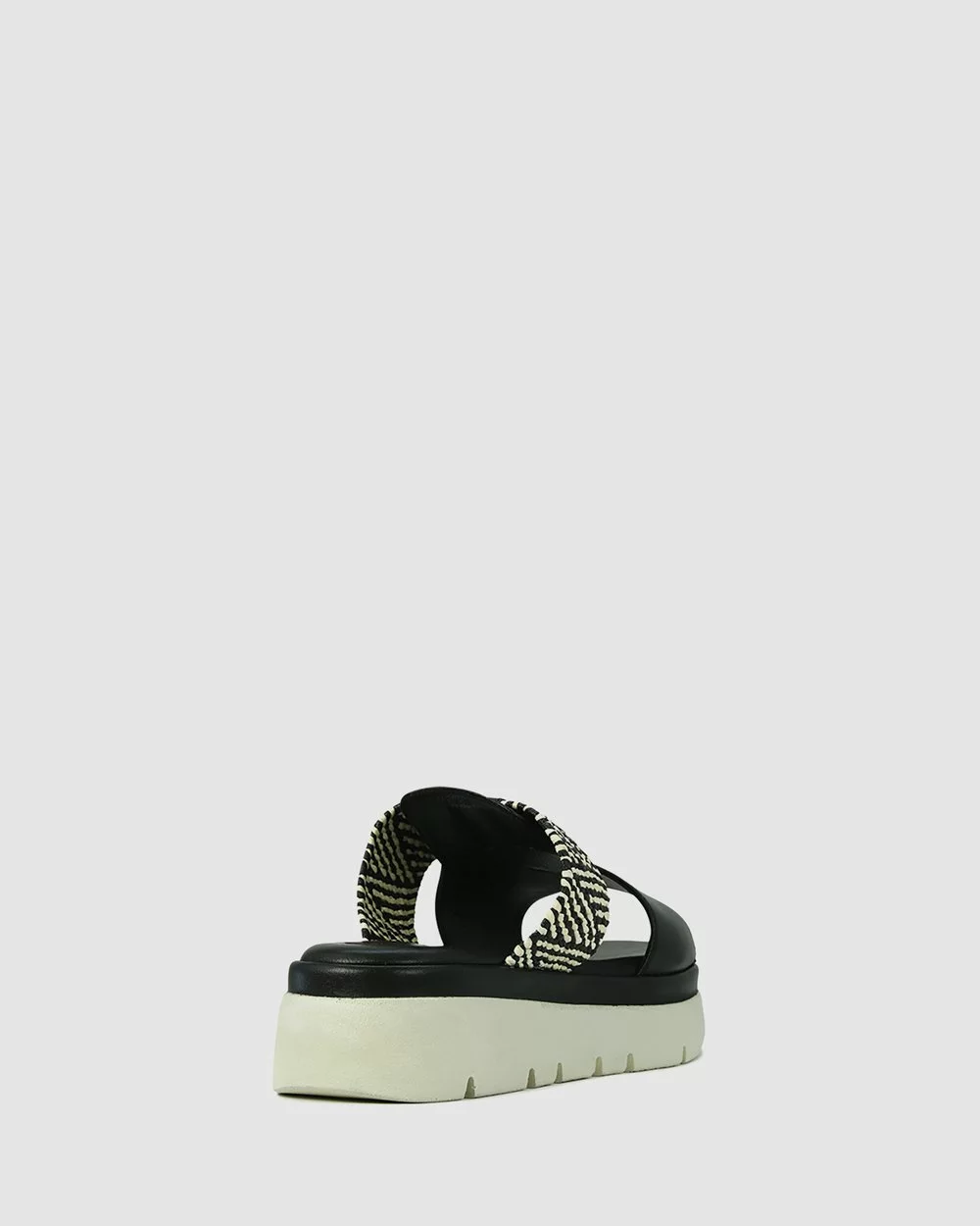– Black leather sandals- Multi white and black fabric – Memory Foam Sole- Open-heeled convenience- Statement elastic for optimal fit