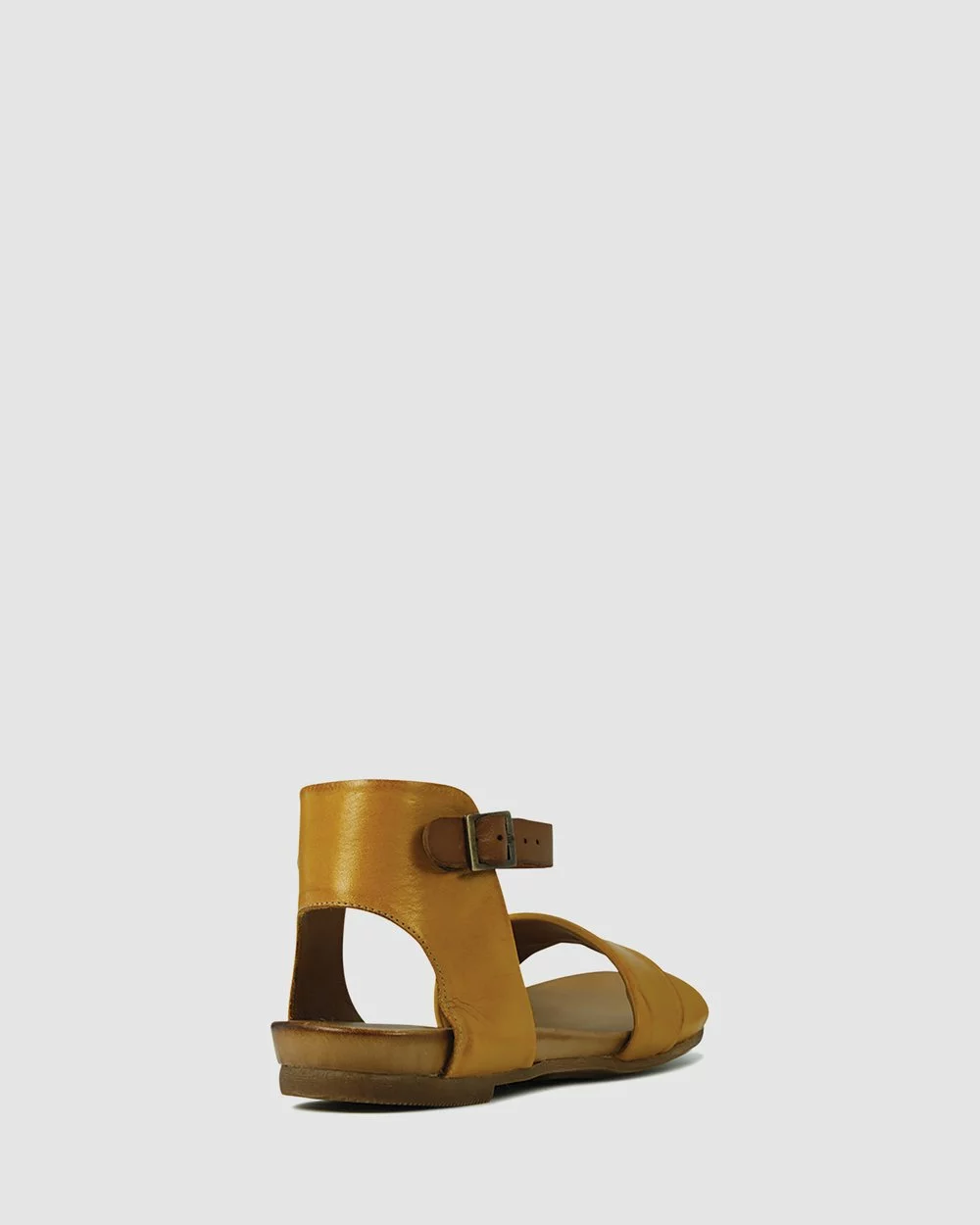 – Soft folded leather – Soft and cushy footbed – Rubber outsole for durability – Buckle-tie back – Flat sandal- Wrapped footbed