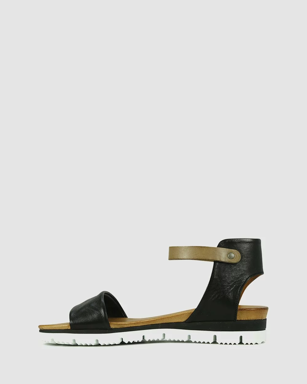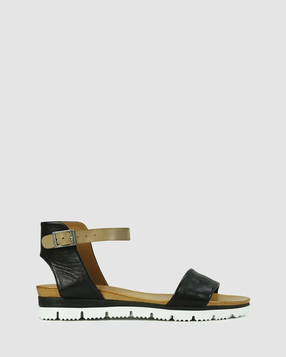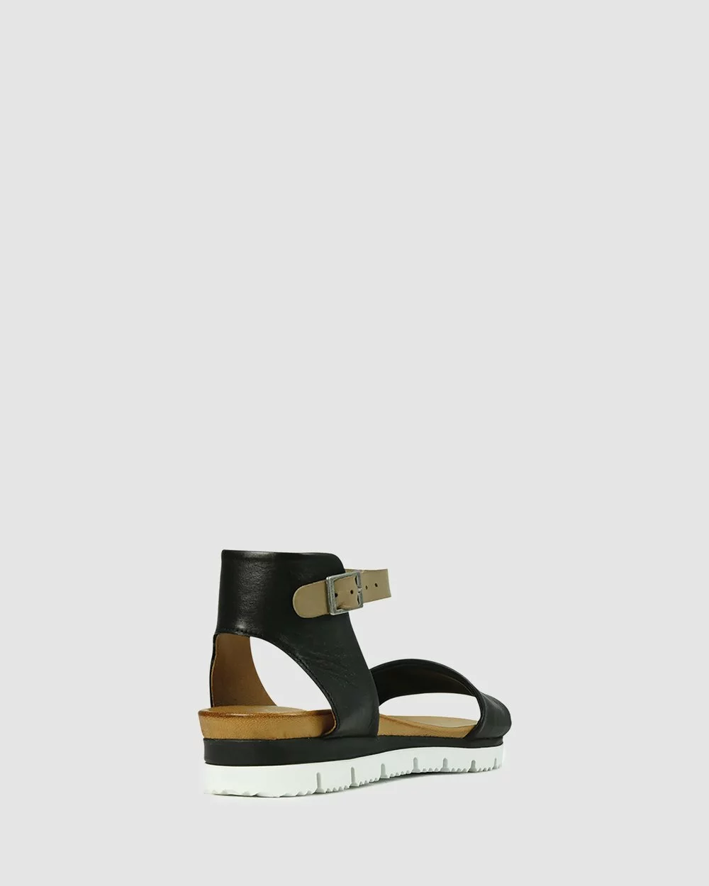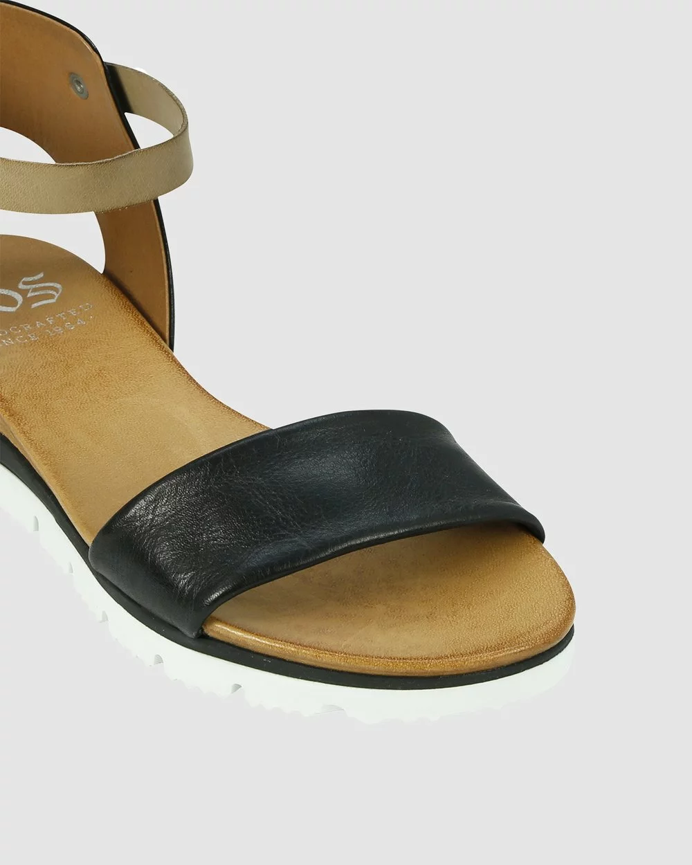 – Made in finest Portuguese leather – Multicolour flexible outsole styling – Accent fastenings on ankle strap – Comfortable sandals – Black sandals – White Flatform