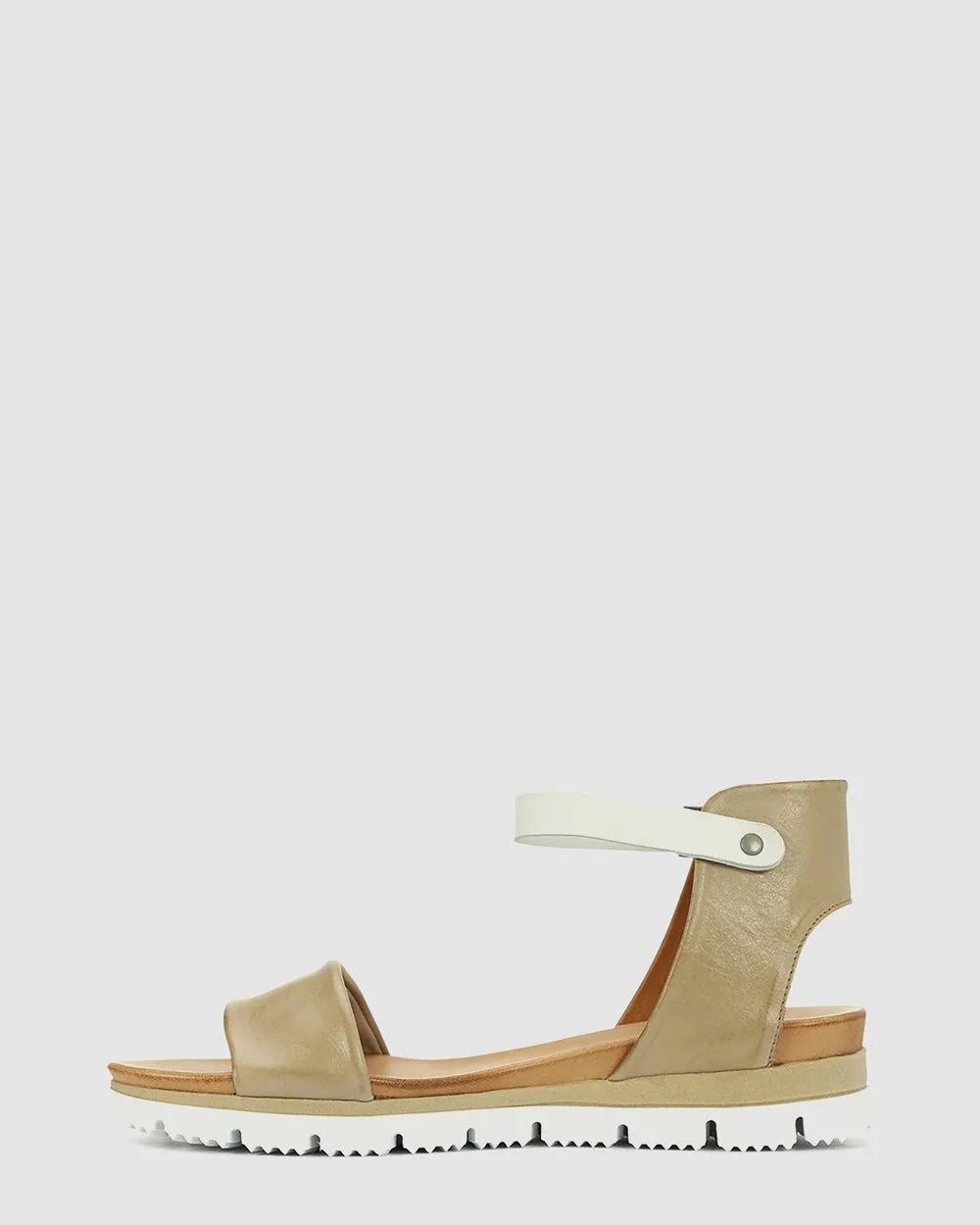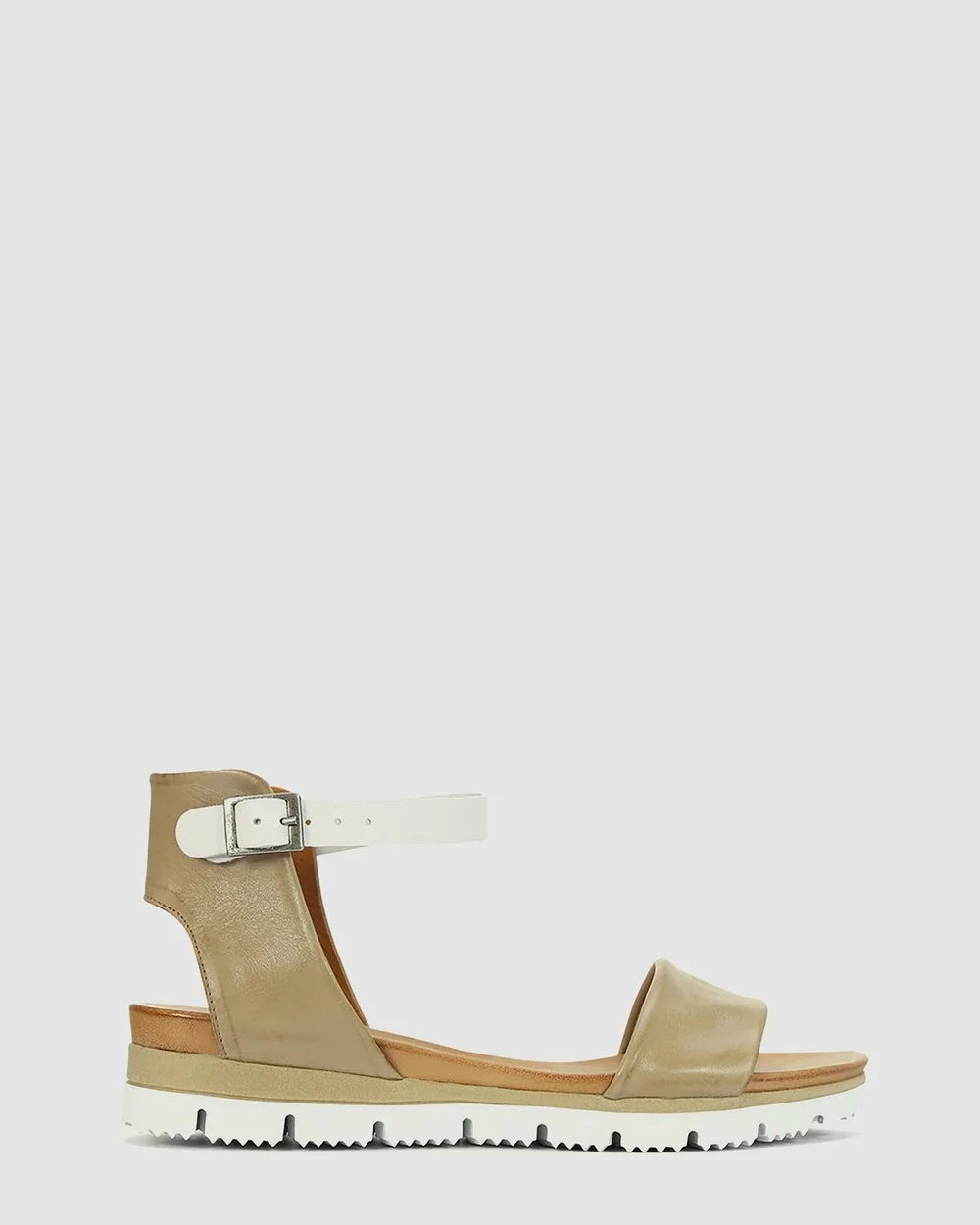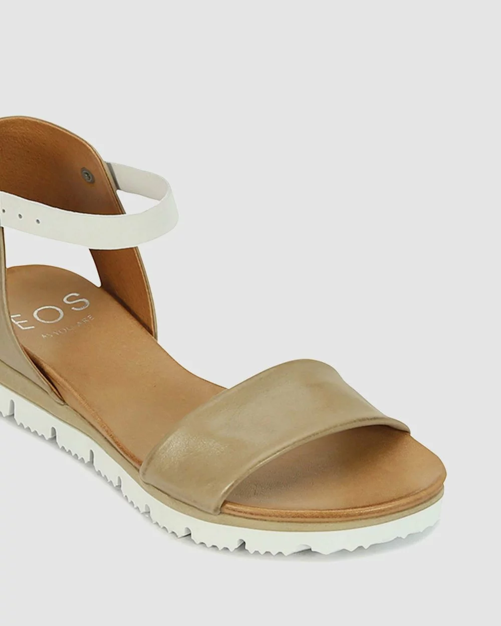 – Made in finest Portuguese leather – Multicolour flexible outsole styling – Accent fastenings on ankle strap – Comfortable sandals – Taupe sandals – White Flatform