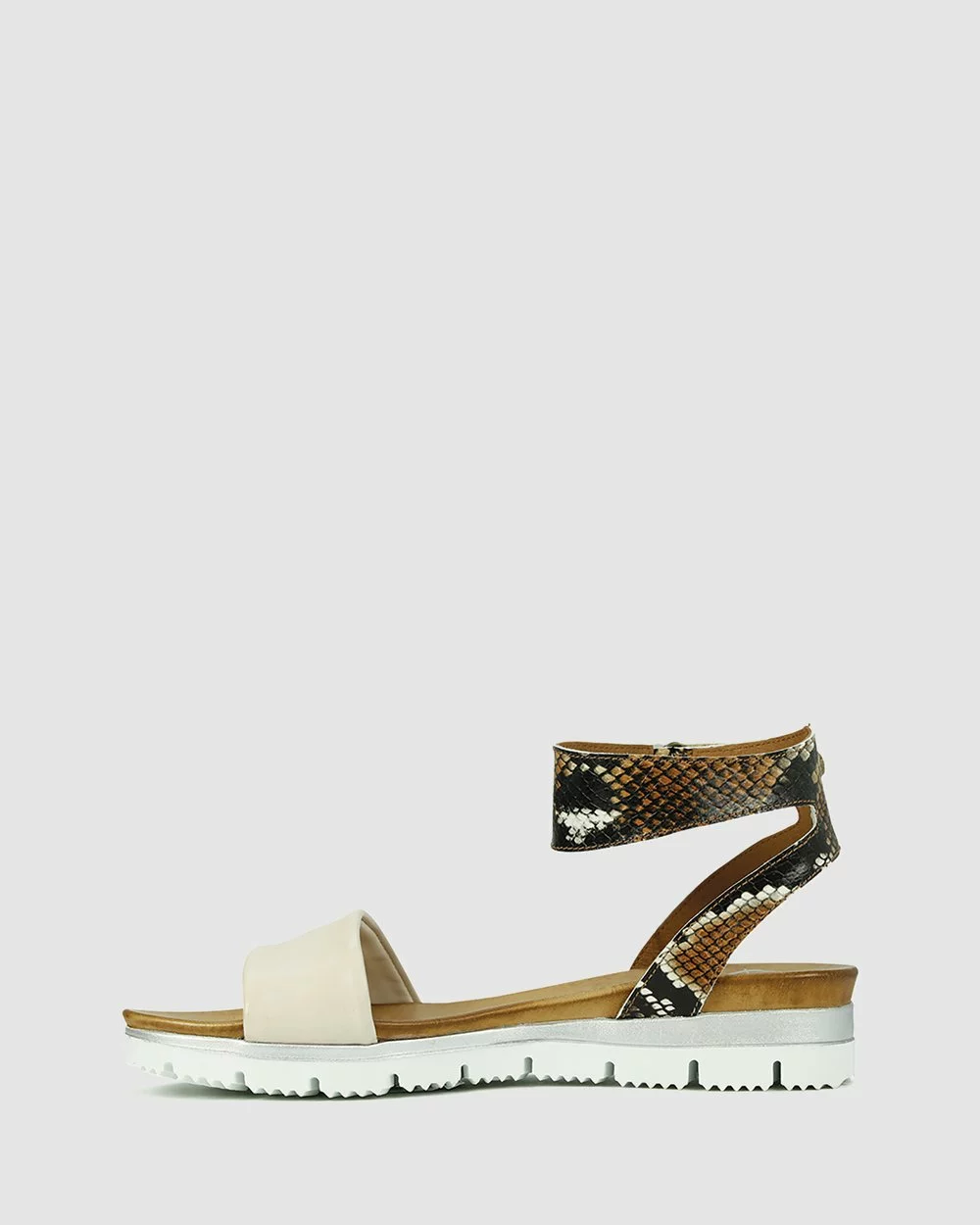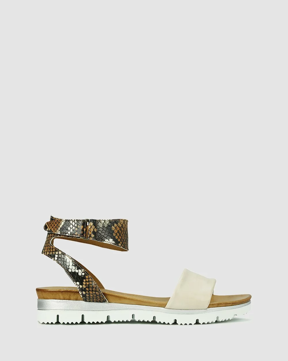 – Made in Portugual- Multicolour flexible outsole styling – Accent fastenings on ankle strap – Comfortable sandals – Pyton sandals – White Flatform