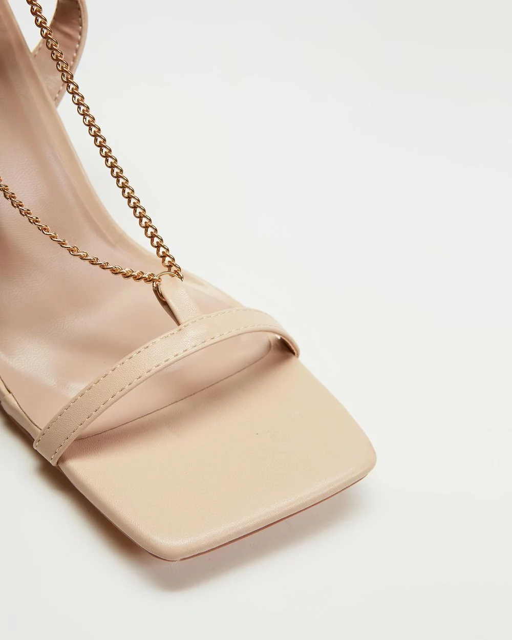 – T-strap to front; gold-toned chain