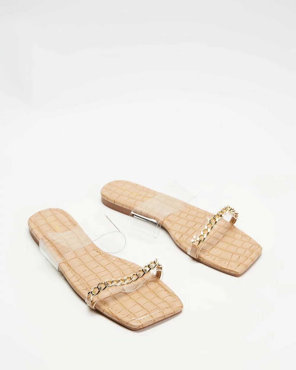 – Twin clear straps, one with gold-toned chain detail