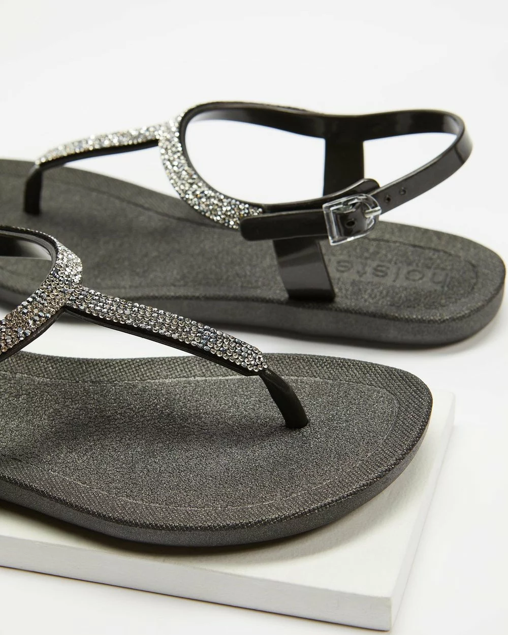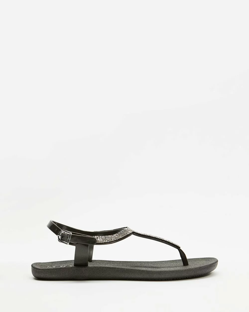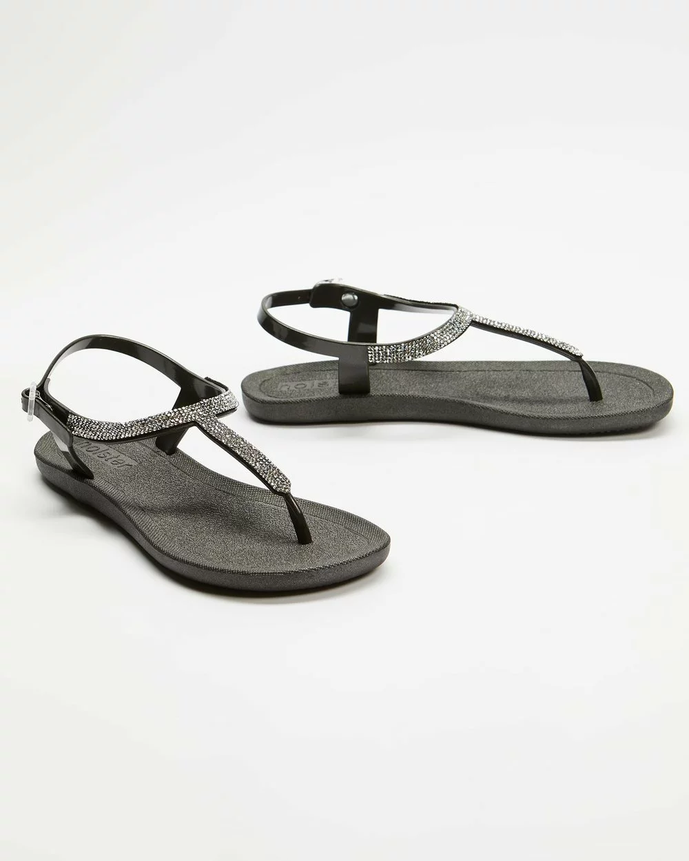 – Smooth jelly-like upper; rhinestone t-bar strap