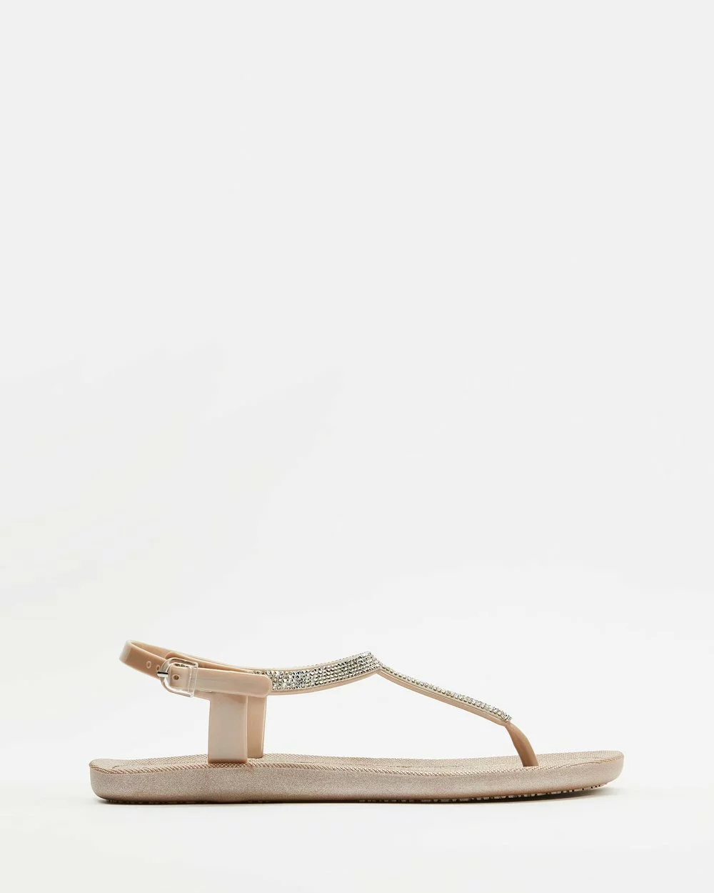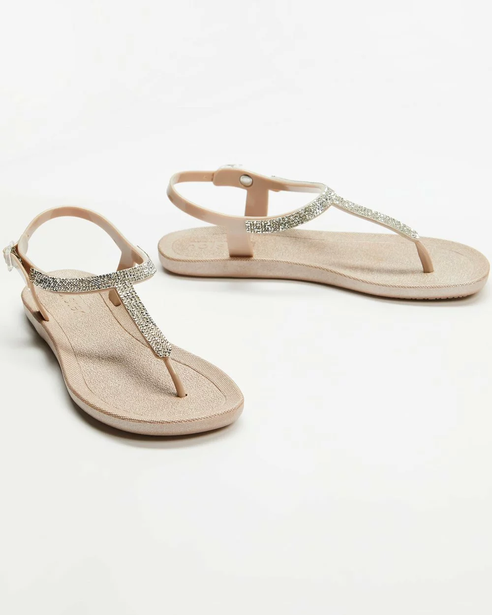 – Smooth jelly-like upper; rhinestone t-bar strap