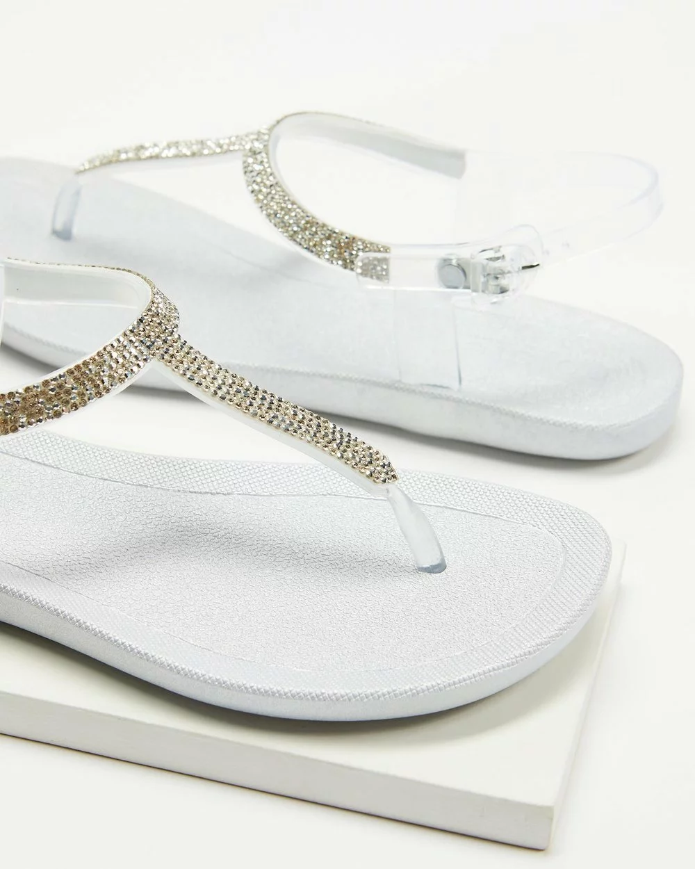 – Smooth jelly-like upper; rhinestone t-bar strap