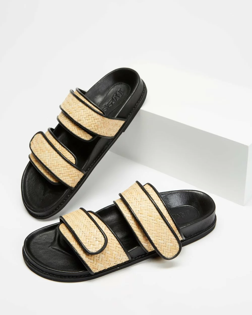 Crafted from supple leather and rattan, the Izano Slides from JAMES l SMITH are perfect for the modern minimalist.