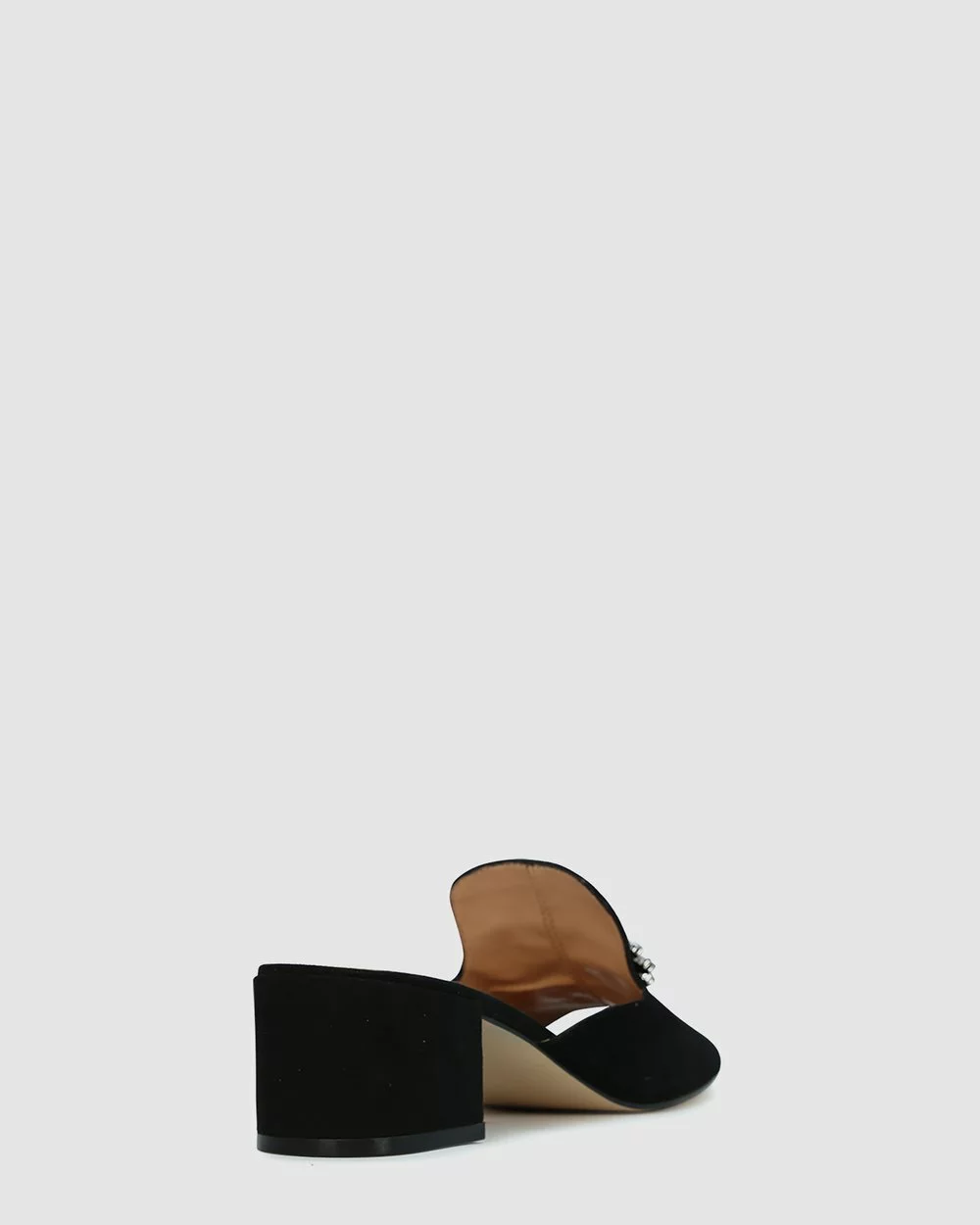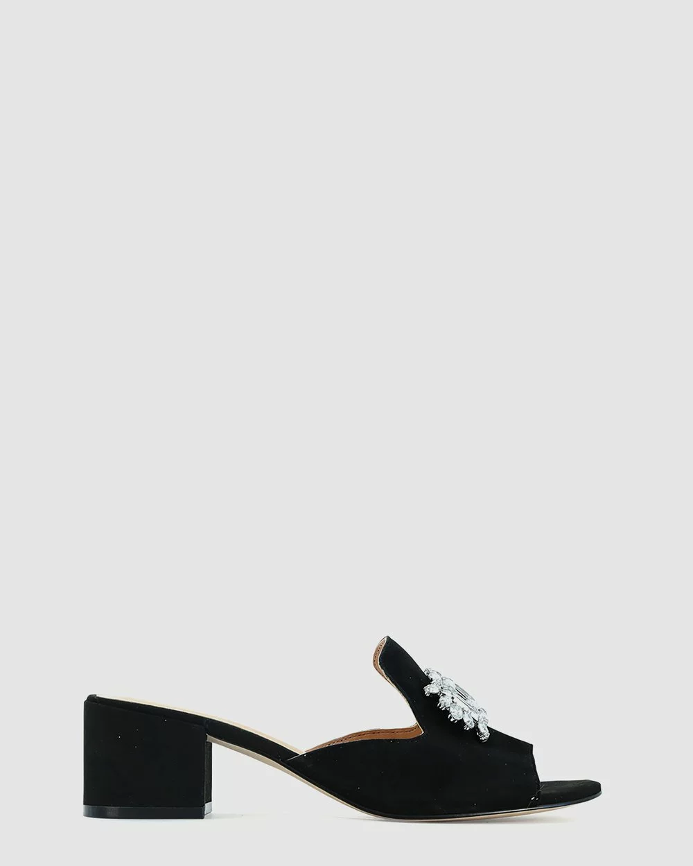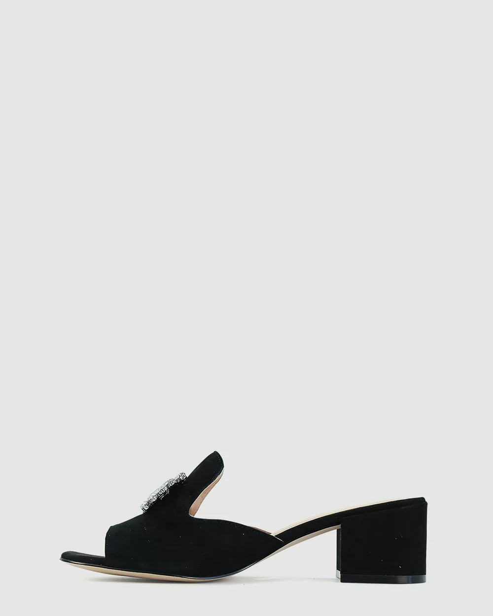 – Black low heel mule – Albert topline style – Open toe mule – Block heels – Decorative accessories – Button-embellished- Pearl, strass shoes