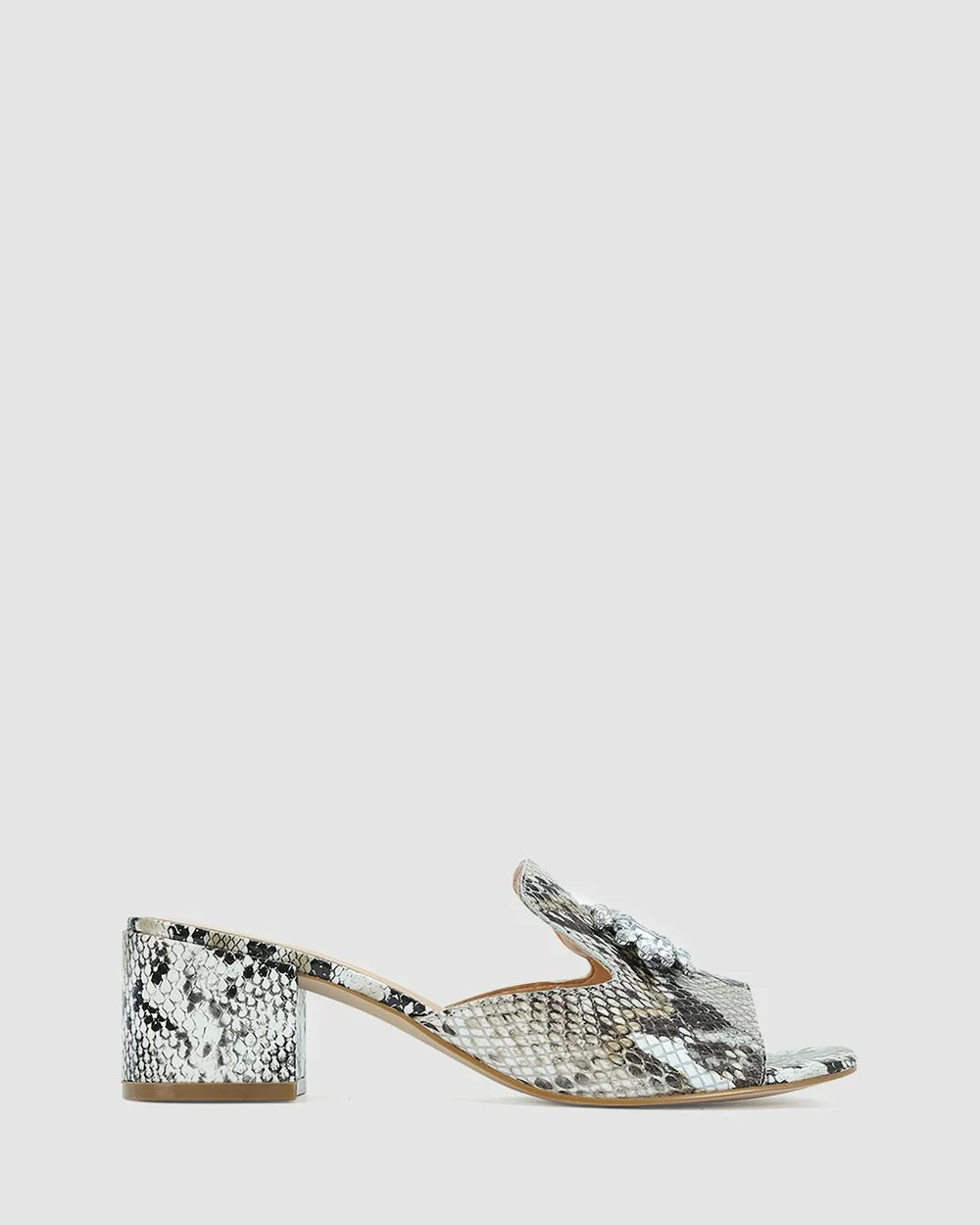– Snake low heel mule – Albert topline style – Open toe mule – Block heels – Decorative accessories – Button-embellished- Pearl, strass shoes