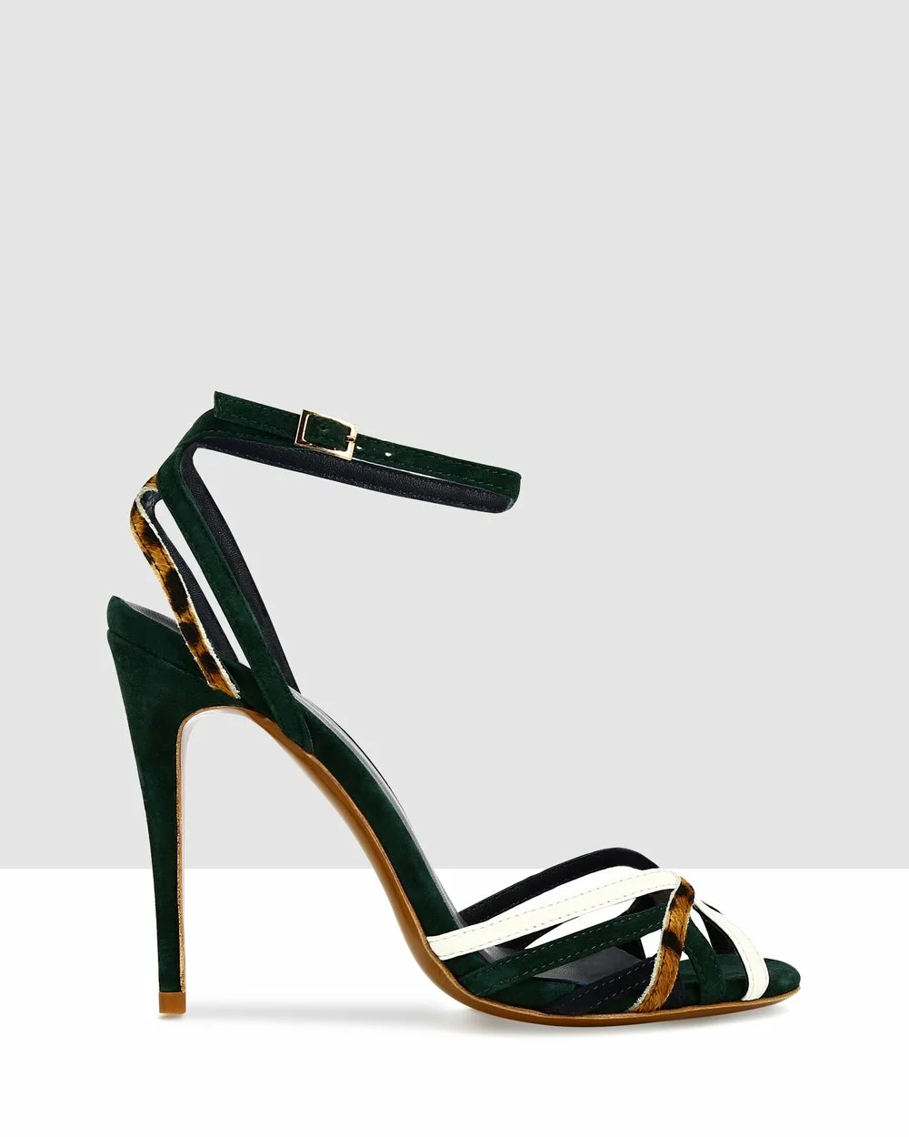 luxurious leathers with essential silhouettes. The Dolly Heel Sandals in Multi coloured leather strapping with touches of leopard cow hide. The 10.5cm heel is comfortable for day-long