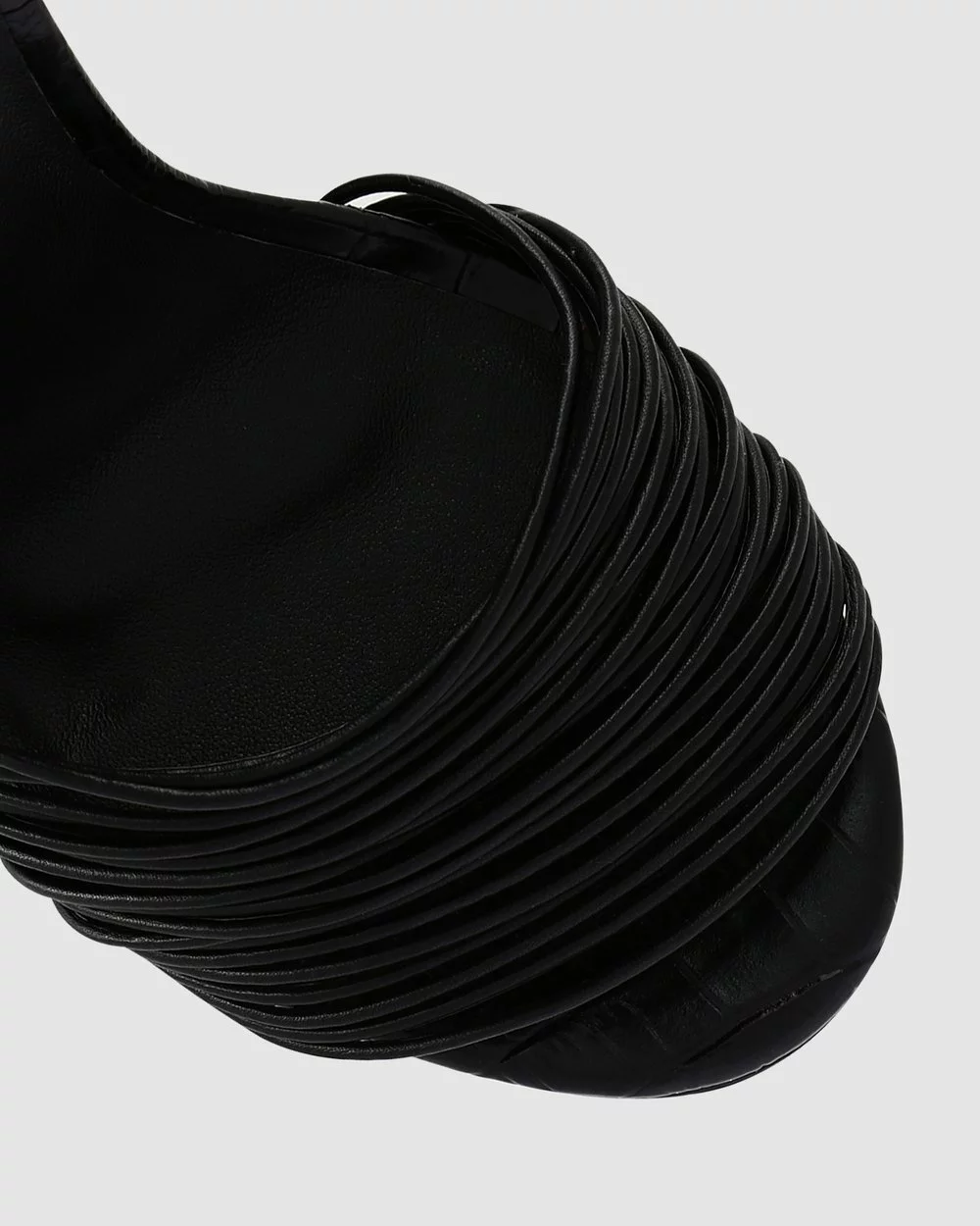 luxurious leathers with essential silhouettes. The Mia Heel Sandals in Black crocodile embossed leather with multiple fine toe straps. The 10.5cm heel is comfortable for day-long
