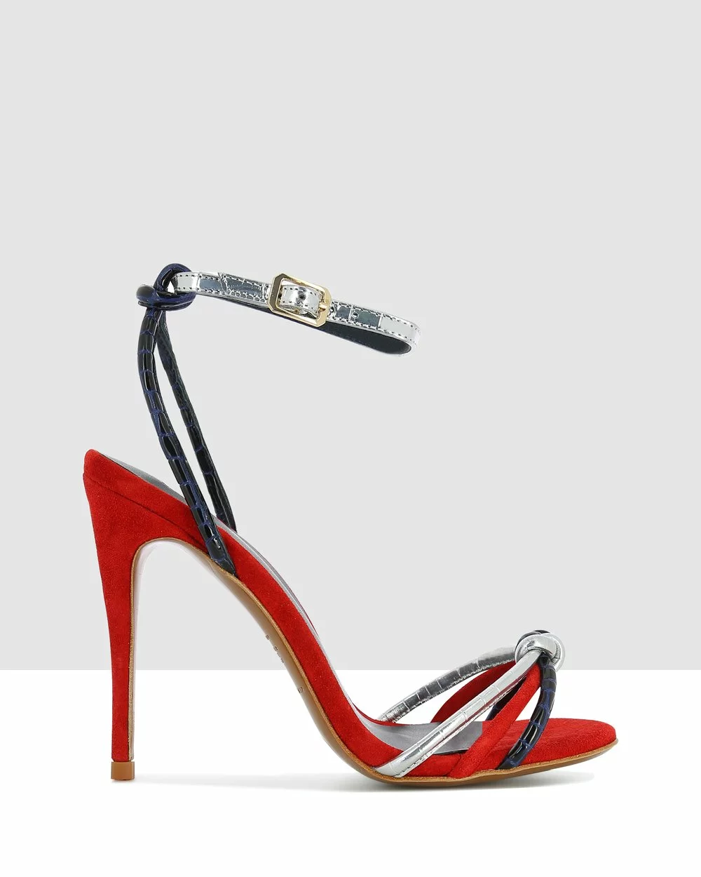 luxurious leathers with essential silhouettes. The Ursula Heel Sandals in a mix of Red suede, Silver and Navy crocodile embossed leather with knot front toe strap. The 10.5cm heel is comfortable for day-long