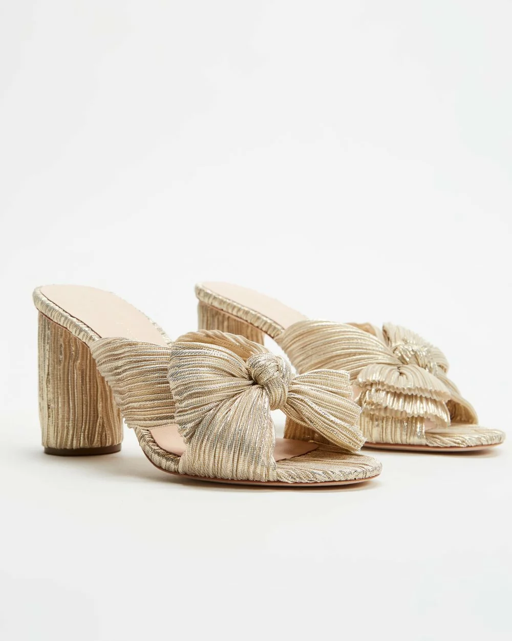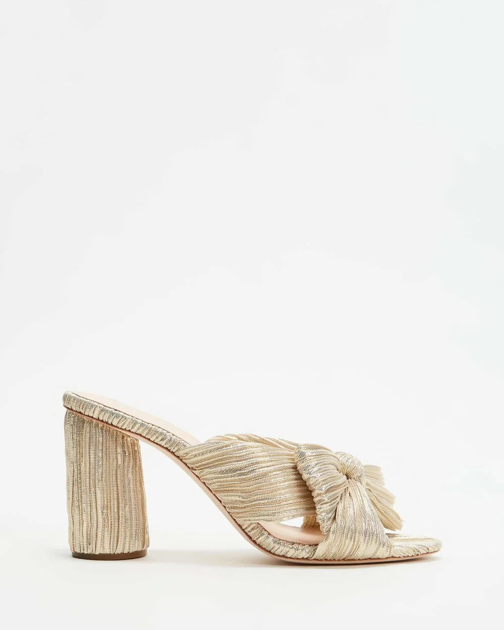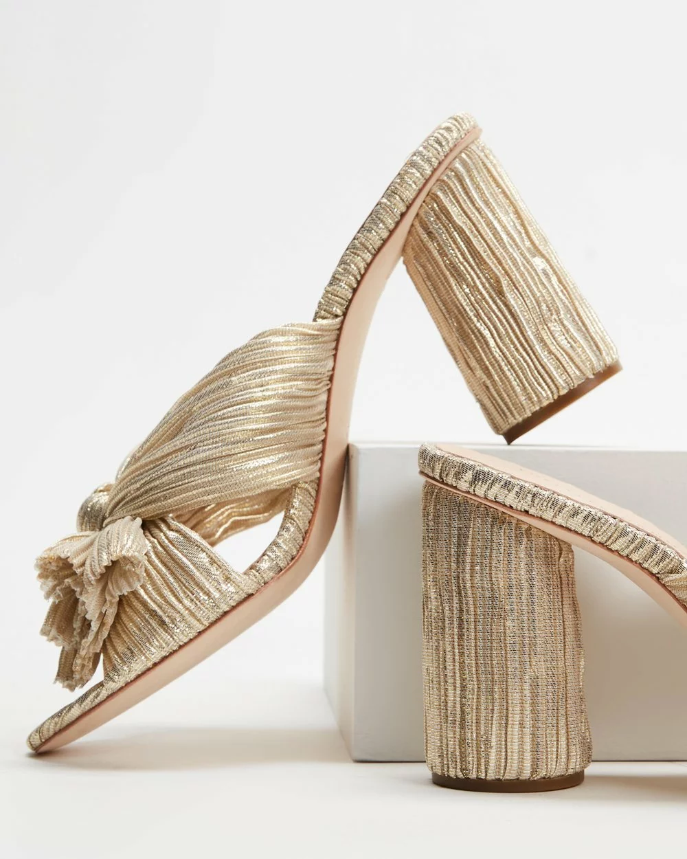 A masterful interplay between opulent glamour and elegance, the Penny mules by Loeffler Randall channel a magnetic charisma. The pleated texture of the lamé upper brings dimension to the metallic gold shade, and will bring textural depth and interest to any outfit.