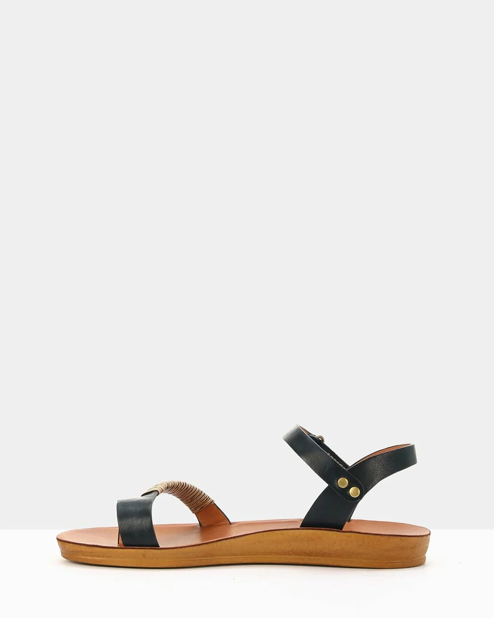 – Aerated polyurethane unit engineered for flexibility and softness – Hand-brushed materials – Resort-styling – Asymmetric toe piece – Ankle buckle fastening – Patterned material front strap