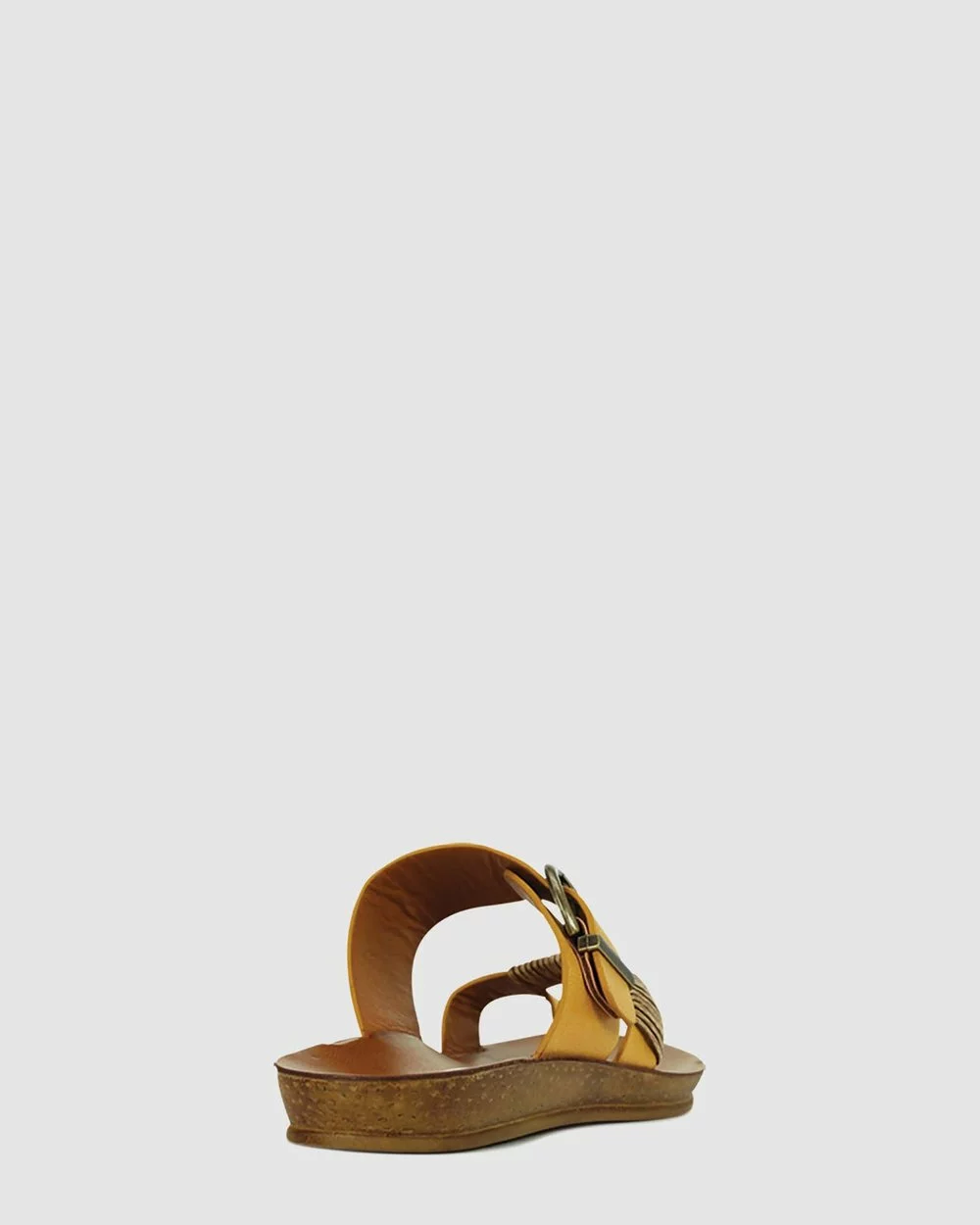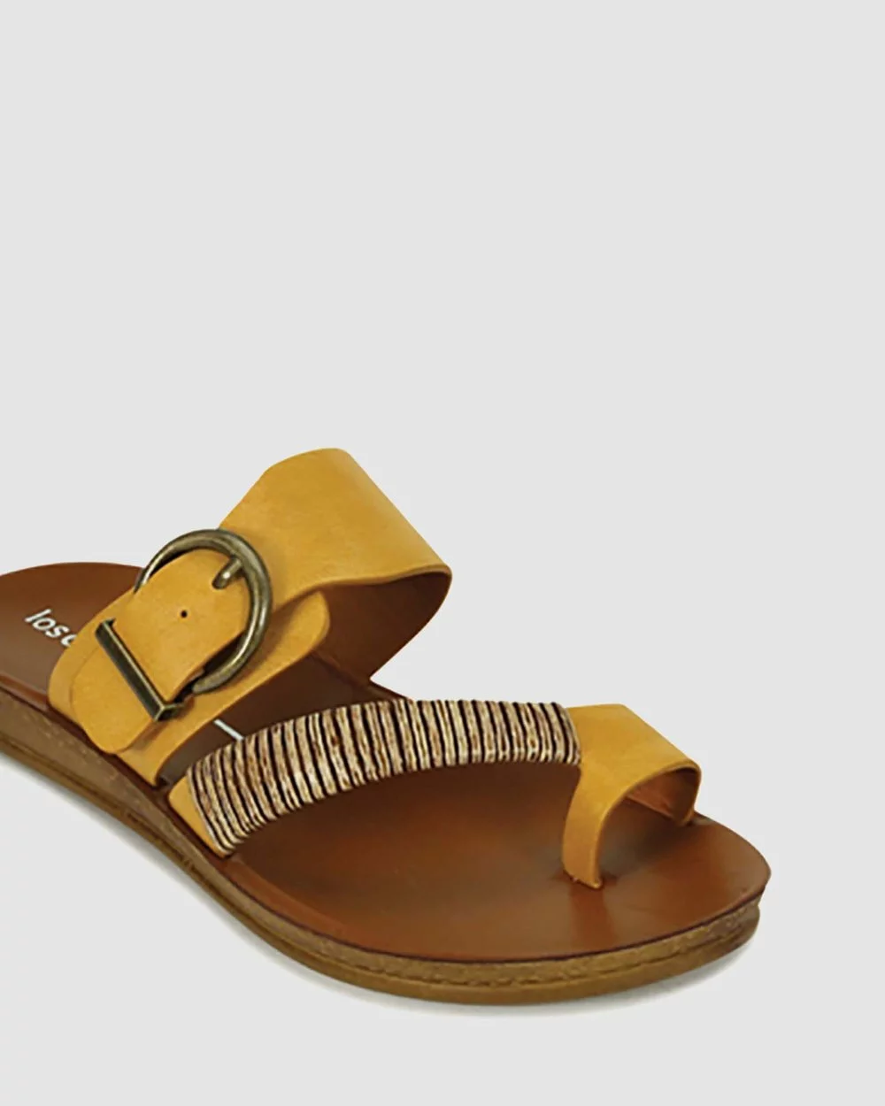 – Mustard shades – Essential summer slide – Toe strap with natural bamboo wrap – Fashionable buckle on ankle strap – Graffiato finish on upper