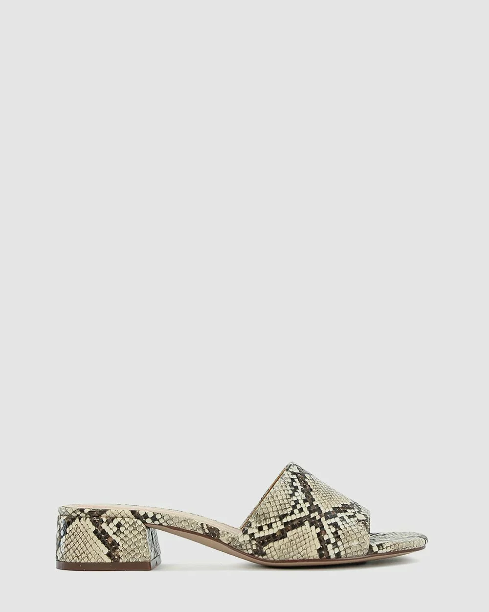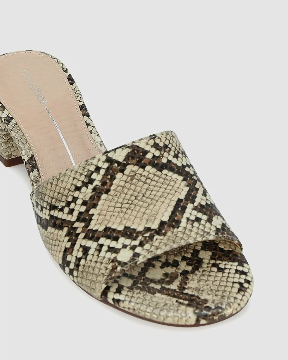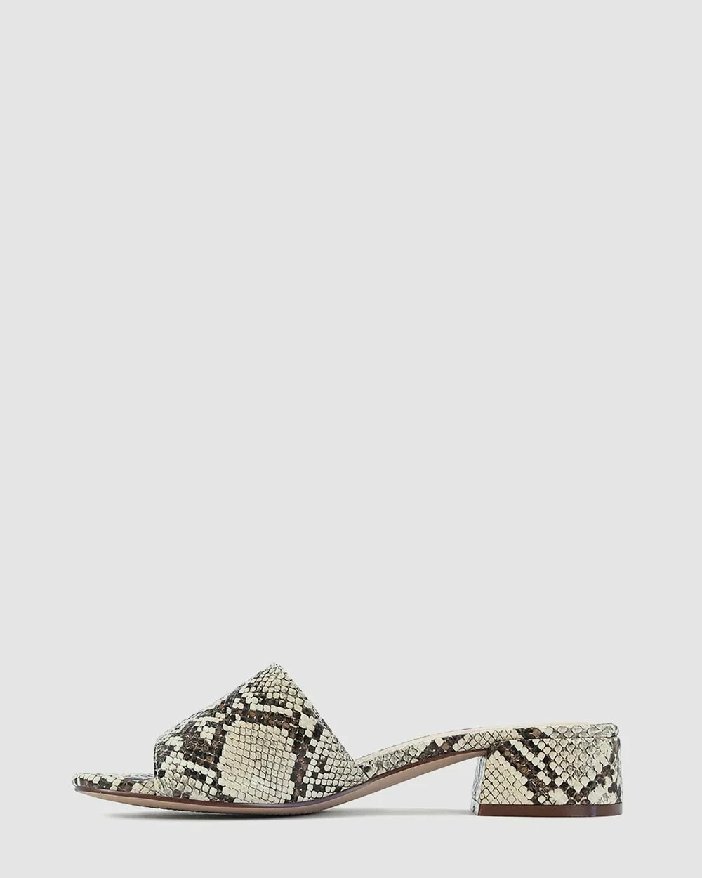 – Snake faux leather – Essential summer slide – Slightly flared, mid-height heel – Classic profile open toe mule- Easy-to-wear comfortable sandal – Dress to impress