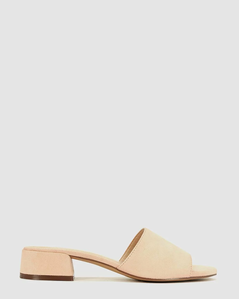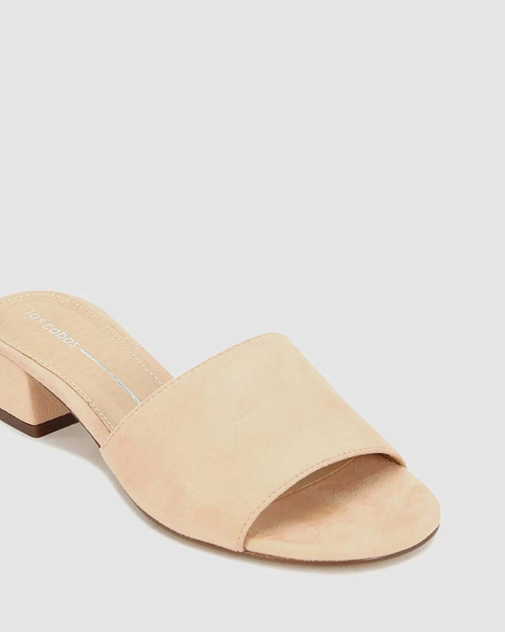 – Nude micro fibre- Essential summer slide – Slightly flared, mid-height heel – Classic profile open toe mule- Easy-to-wear comfortable sandal – Dress to impress