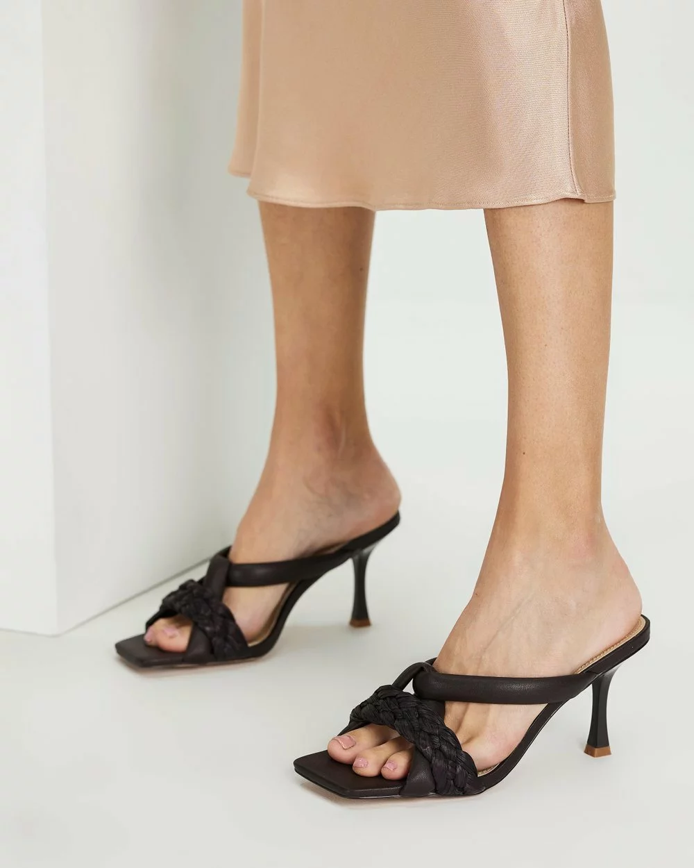 Australian designer label Manning Cartell delivers considered collections that speak to a contemporary, streetwise sophisticate. Set upon a subtly flared heel and on-trend square toe, the European-made Above & Below Mules are finished in a considerate rich chocolate faux leather with braided raffia detailing.