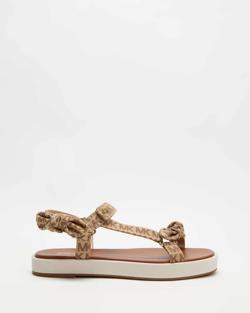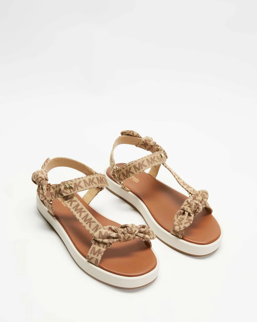 The Phoebe Sandals feature an ever-trending Michael Kors monogram design. These sandals take an edgy strappy design and add elegant touches with a monochromatic look and bow accents.
