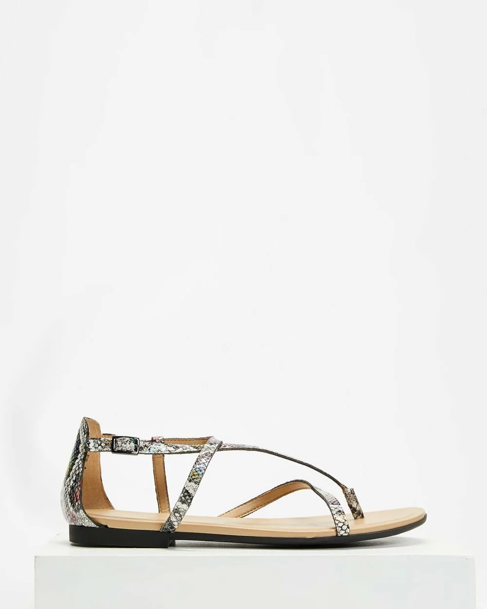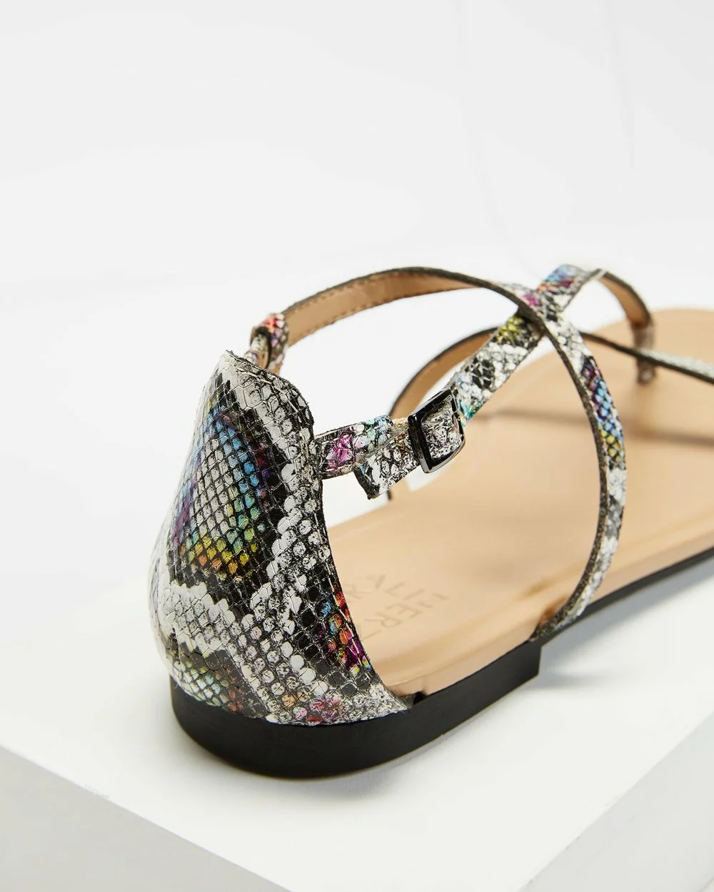 – Cross-over straps; buckle closure to ankle