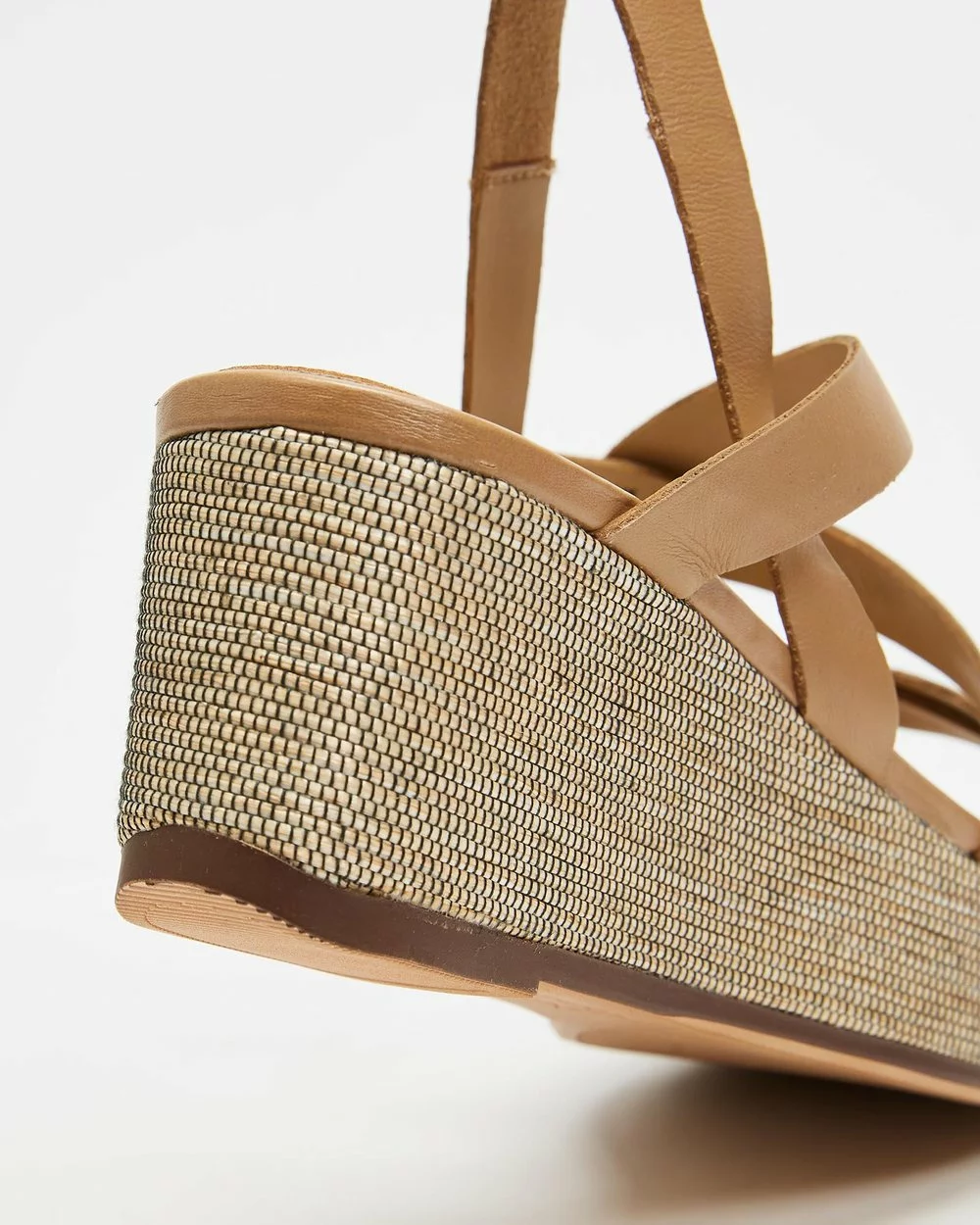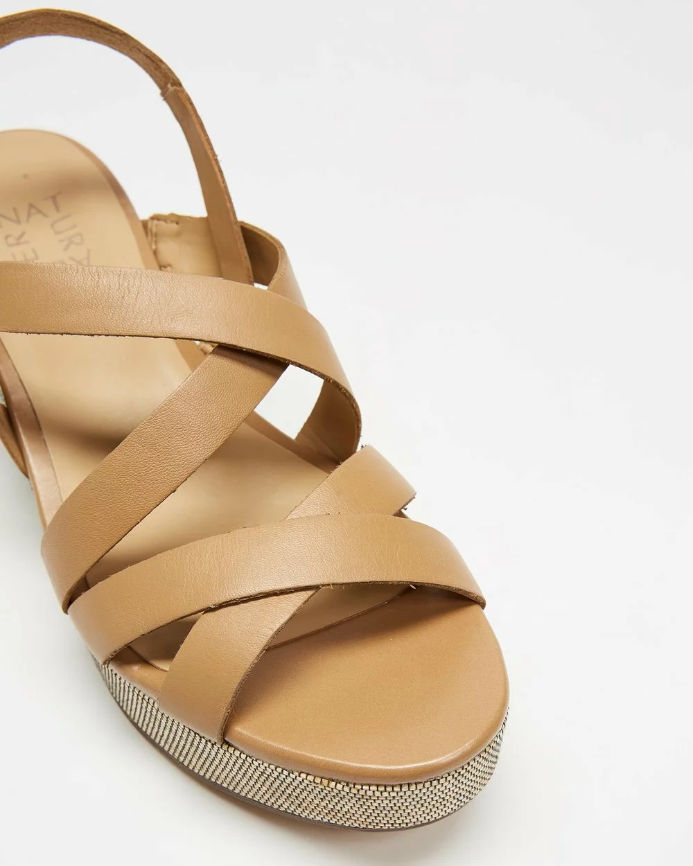 Naturalizer's Unique wedge heels feature a strappy, smooth leather upper that's juxtaposed against a textural woven-look midsole.
