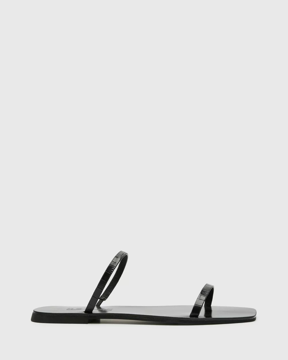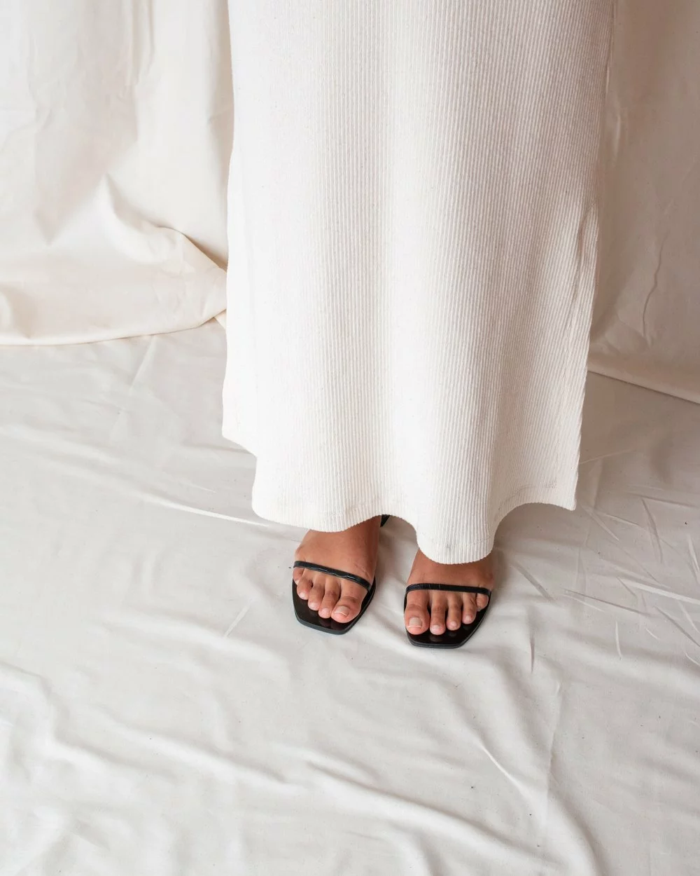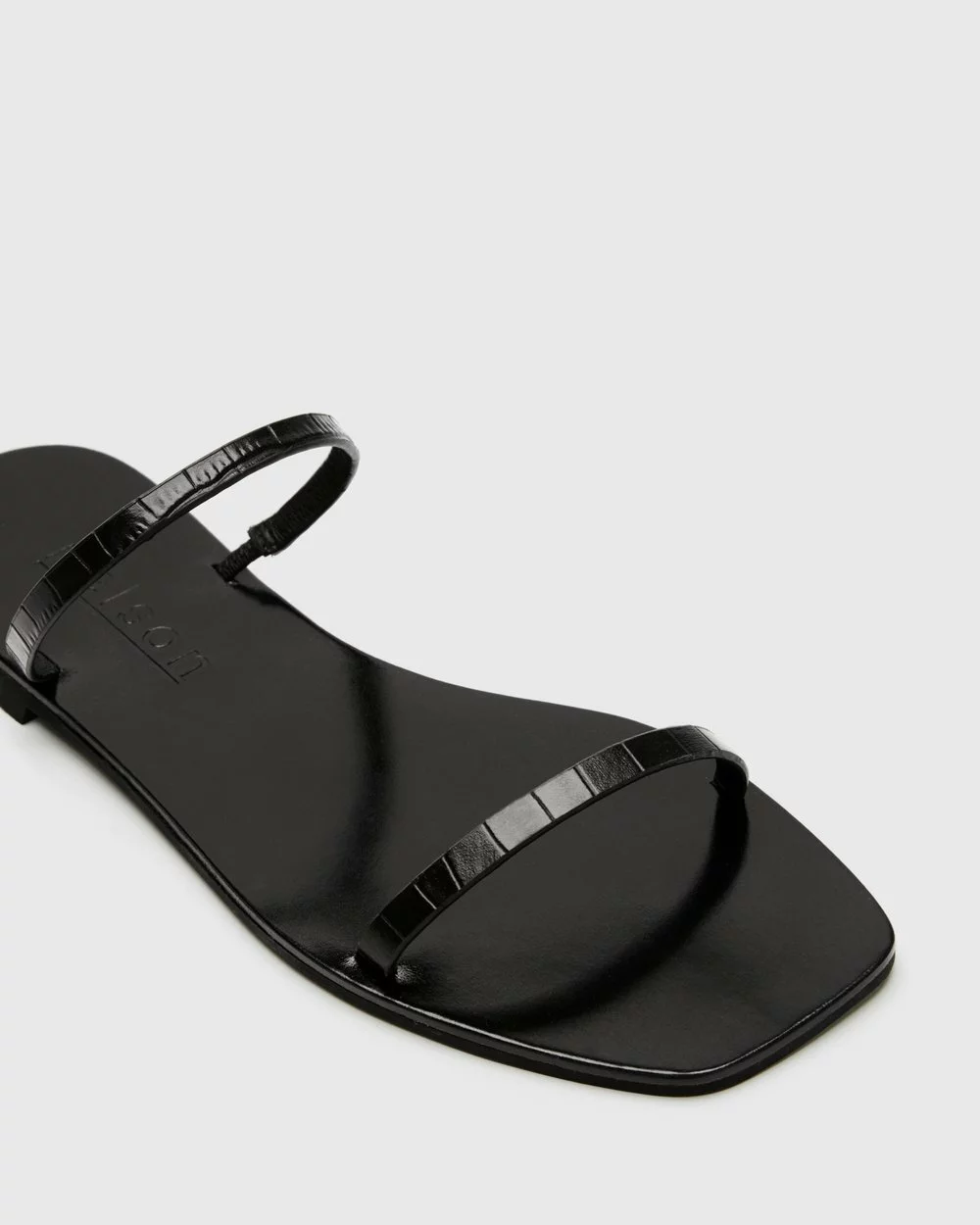 Cult footwear label Nelson Made value sustainable shoe-making in a slow-fashion, small-batch industry. The Audrey sandals are cut from black croc embossed leather and crafted in Melbourne, Australia. Audrey features delicate thin straps and a small square heel.