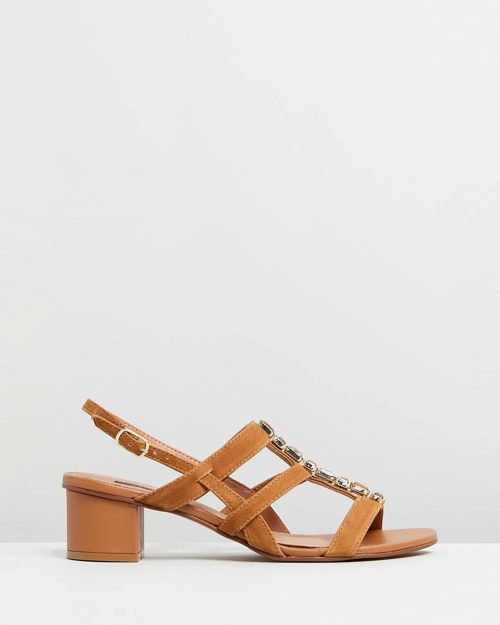 – Cage-like straps to vamp; jewelled embellishments through centre