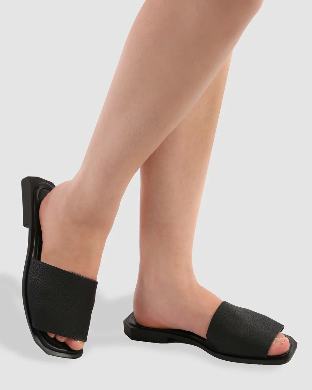 The Anisa Flat Sandals by S by Sempre Di can change up your casual look with these perfect slides. A sophisticated alternative to a thong. The leather one band strap poses a clean silhouette, a square toe on a matching flat unit makes them super comfortable.
