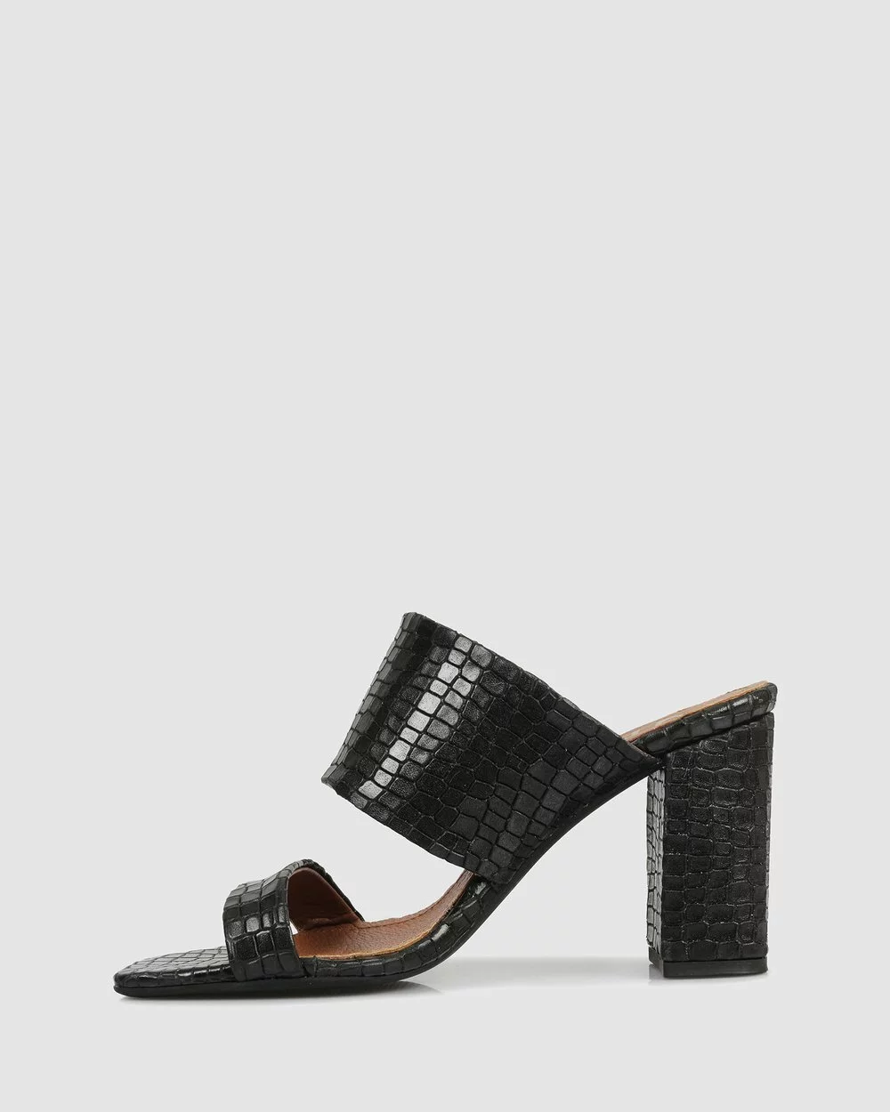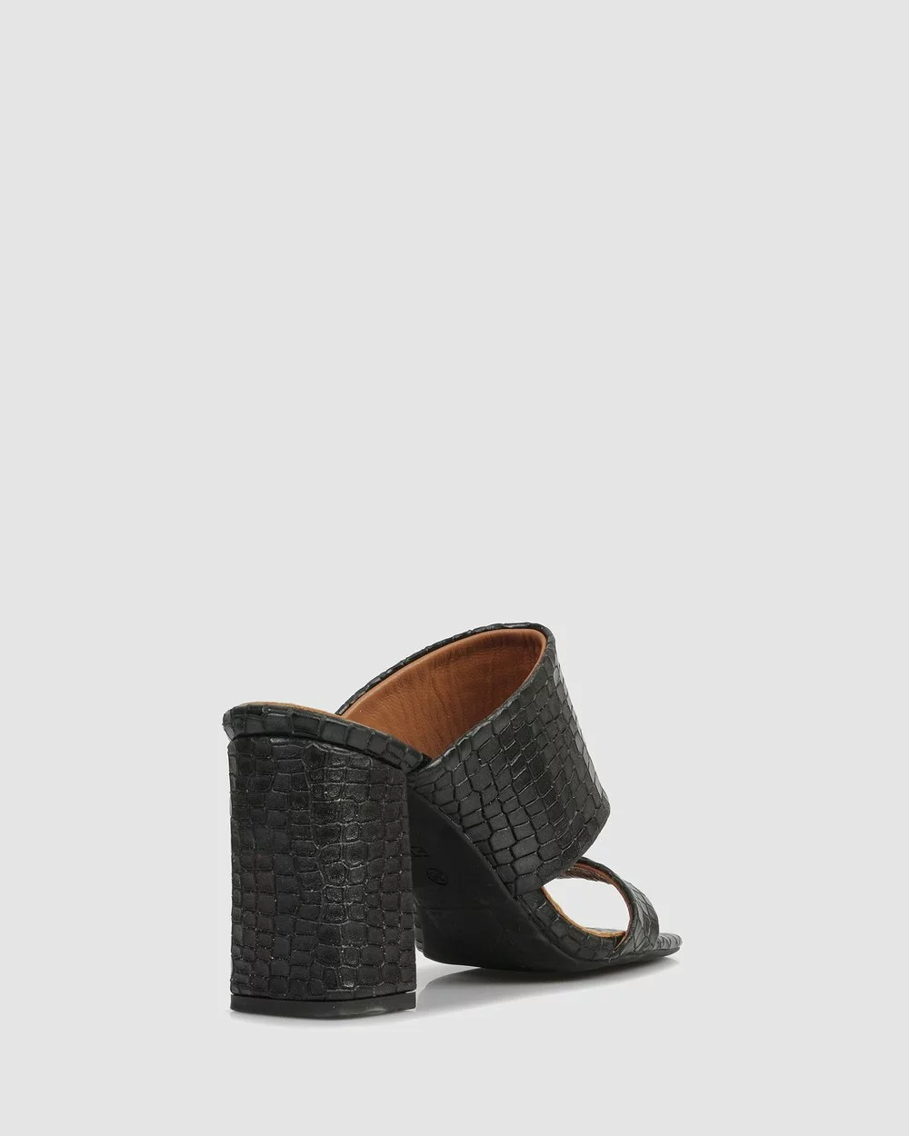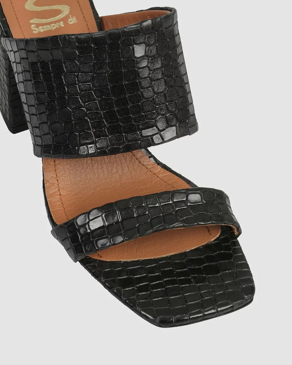 The Ariana Block Sandals by S by Sempre Di are crafted in a croc printed leather. These block heels are paired with a square toe shape and two straps on the upper to provide support. Take texture, mix it with style, and you’ll get this contemporary shoe.