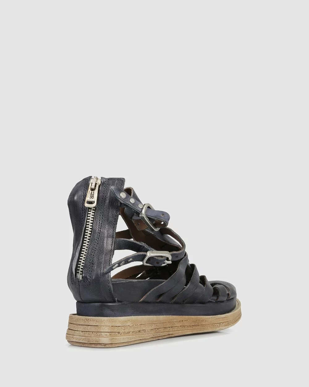 The Koral Sandals by S by Sempre Di is the statement sandal this summer. Gladiator influenced sandal is made with the finest of leathers. This unique sandal comprises of two thin straps around the ankle with fastening buckles along with a back heel counter zipper to ensure the foot is supported for all day walking. Crafted on a foot bed supported with an extra sole and rubber tread will provide not only height but comfort. The blue leather makes this foot bed sandal super stylish with any summer outfit.